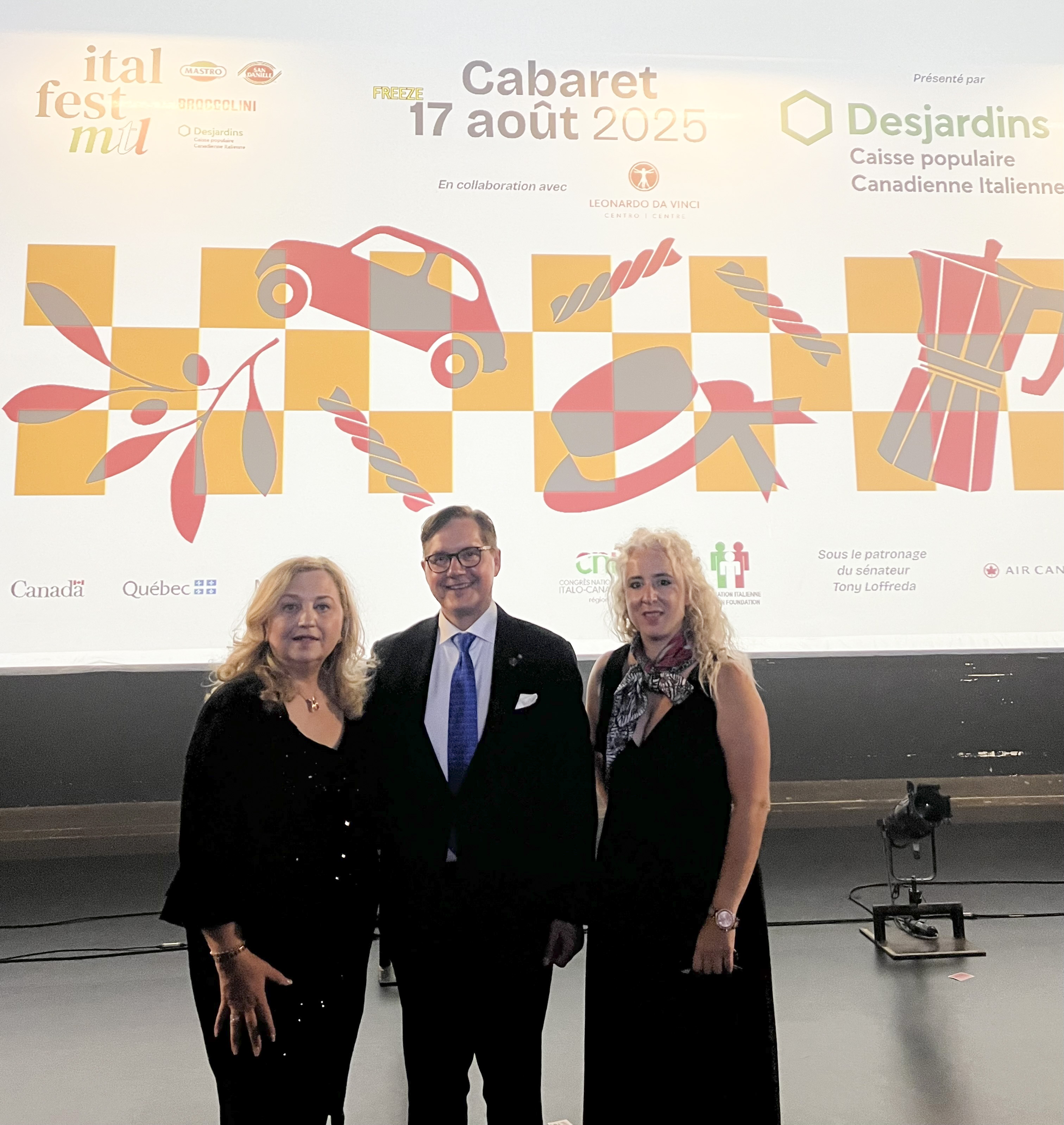 Sunday, August 17, 2025 – Senator Tony Loffreda, centre, with President of the Italian Congress Maria Battaglia, left, and Director General of ItalFestMTL 2025 Francesca Sacerdoti; ItalFestMTL 2025; Montréal, Quebec.