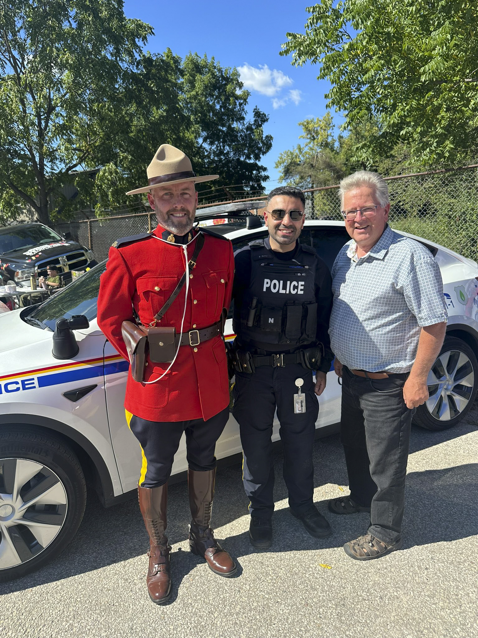 Thursday, August 21, 2025 – Senator Rob Black, right, with a local police officer and RCMP officer; Fergus Fire Station, Fergus, Ontario.