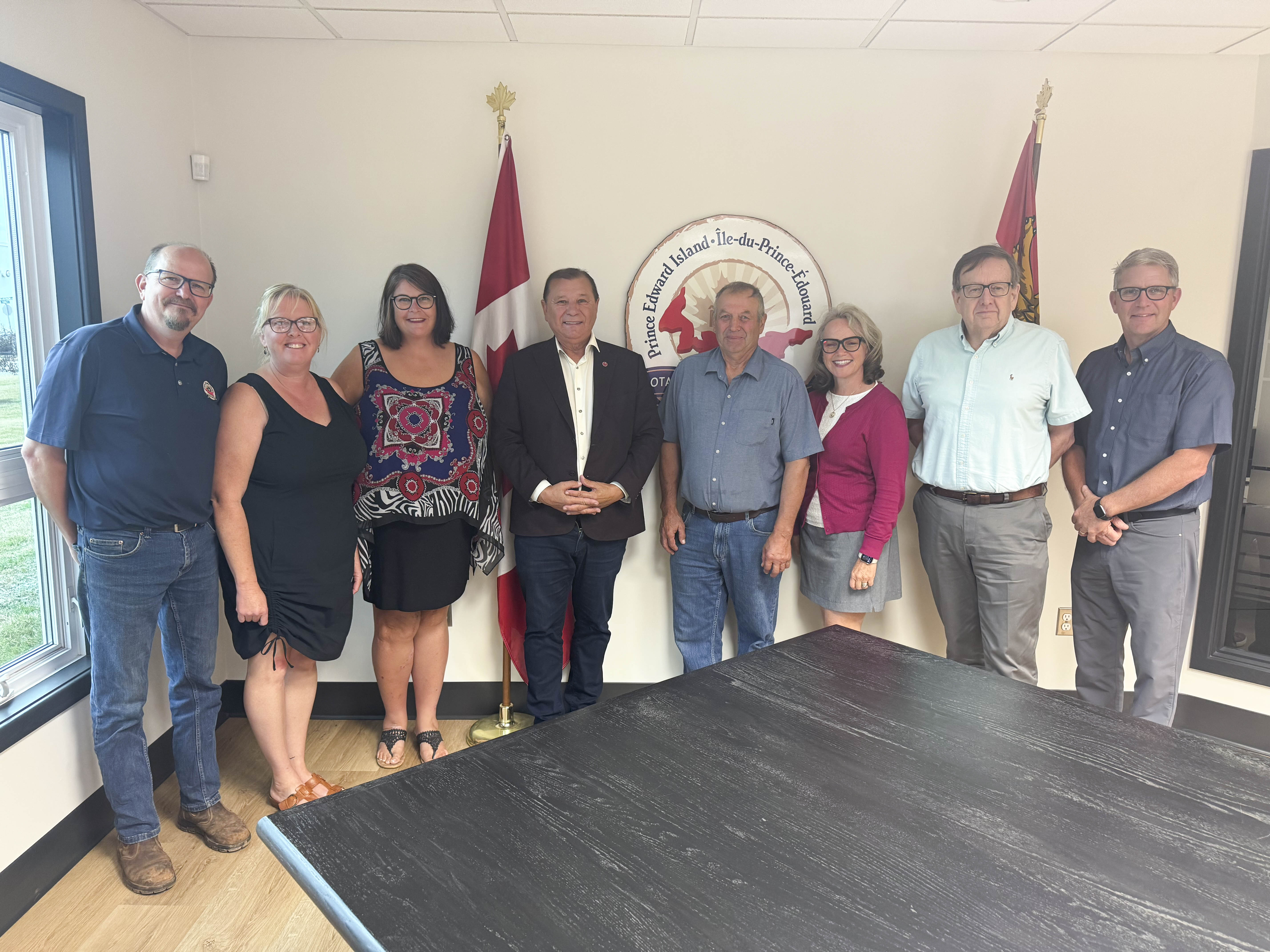 Monday, August 25, 2025 – Senators Brian Francis, fourth from left, Mary Robinson, third from right, Percy Downe, second from right; meeting with the Prince Edward Island Potato Board; PEI Potato Board offices, Charlottetown, PEI.