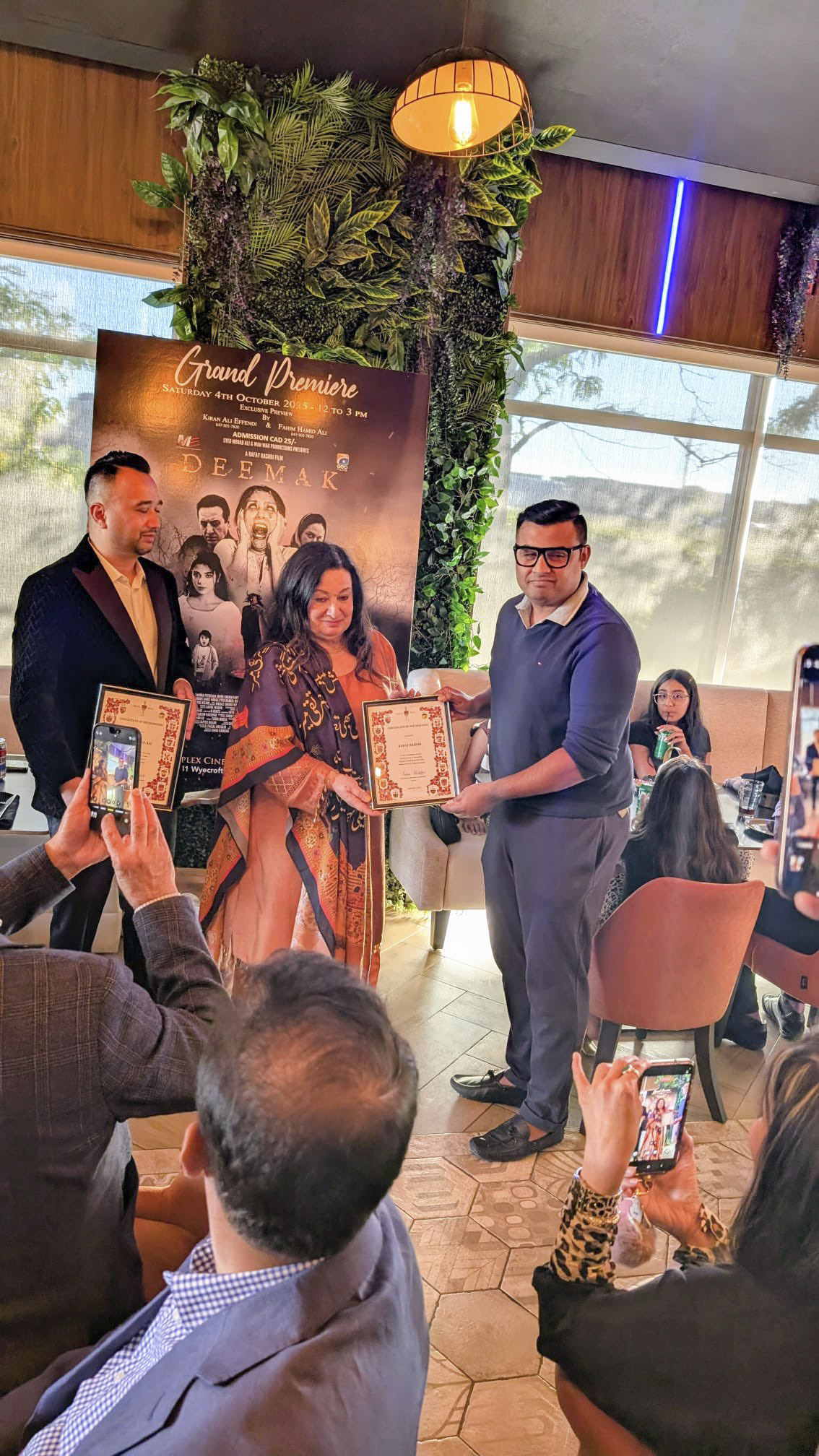 Tuesday, September 2, 2025 – Senator Salma Ataullahjan, with Deemak producer Syed Murad Ali and director Rafay Rashdi; film poster ceremony for Deemak; Oakville, Ontario.