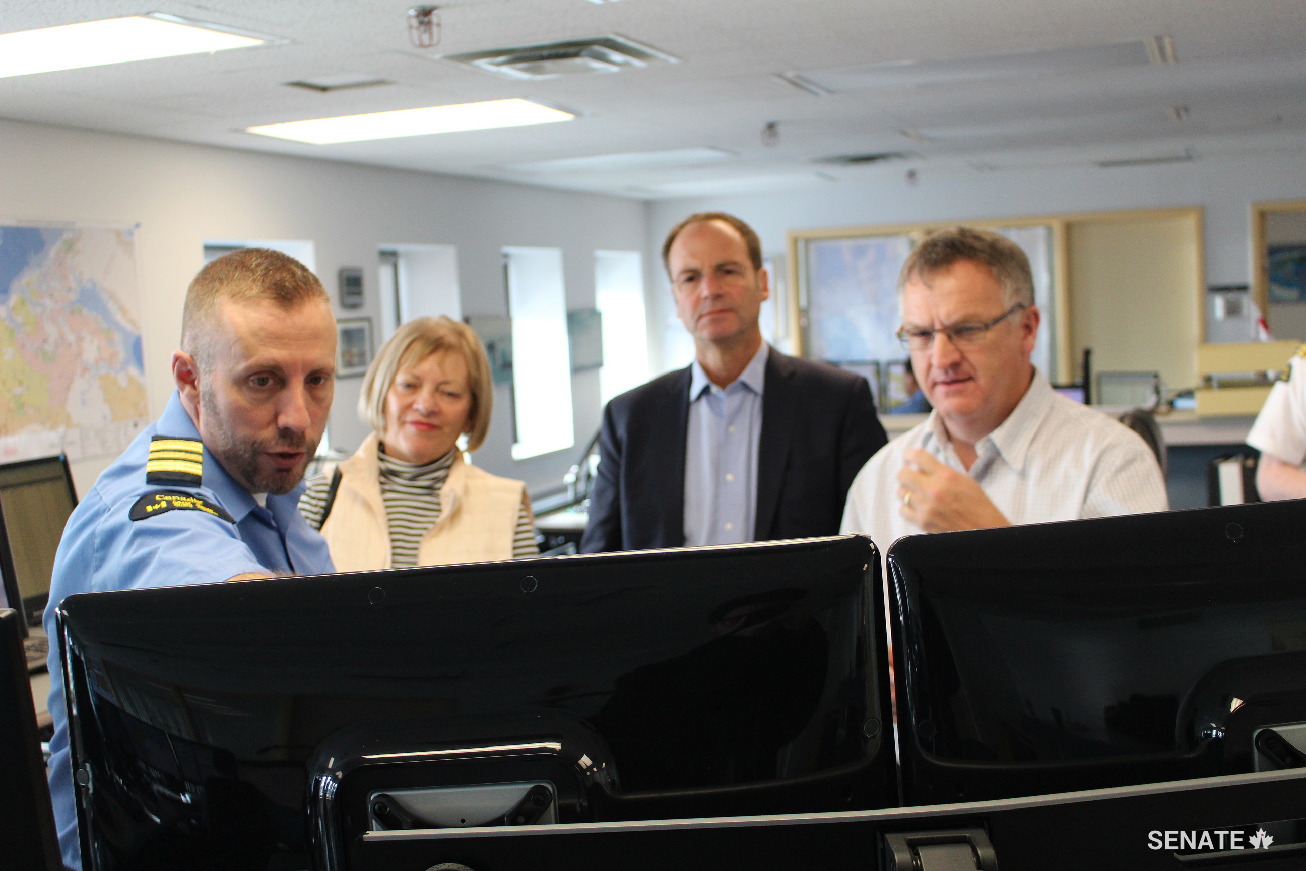 From right, committee chair Senator Fabian Manning, deputy chair Senator Marc Gold and Senator Nancy Hartling follow Louis Robert’s explanation of software used to monitor marine traffic in the Arctic at the Canadian Coast Guard’s Iqaluit communications facility. The coast guard is expecting a steady increase of marine traffic through the treacherous Northwest Passage as the North continues to warm.