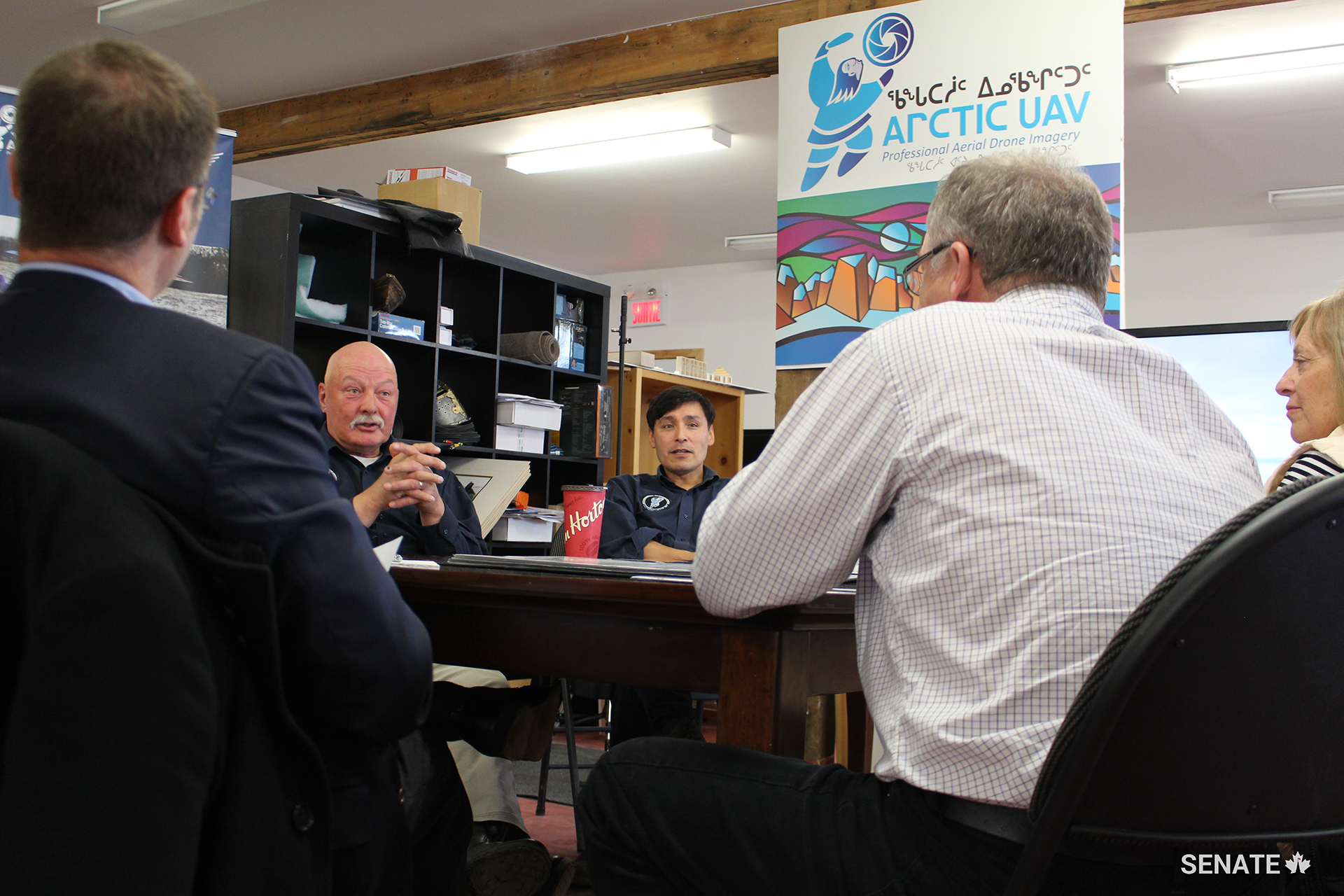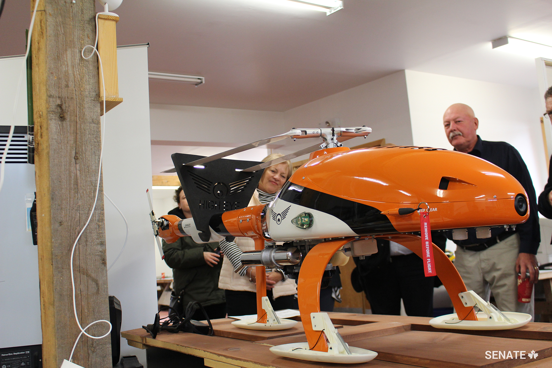 Senator Hartling and Mr. Williams examine one of Arctic UAV’s drones in the company’s Iqaluit workshop. The machines cost approximately $300,000. That may be too pricey for most people, but, for government, it is much cheaper than having to send military aviation assets to the North — the committee heard it costs approximately $12,000 an hour to operate a Hercules aircraft. Mr. Williams said the company also prides itself on training local drone pilots.