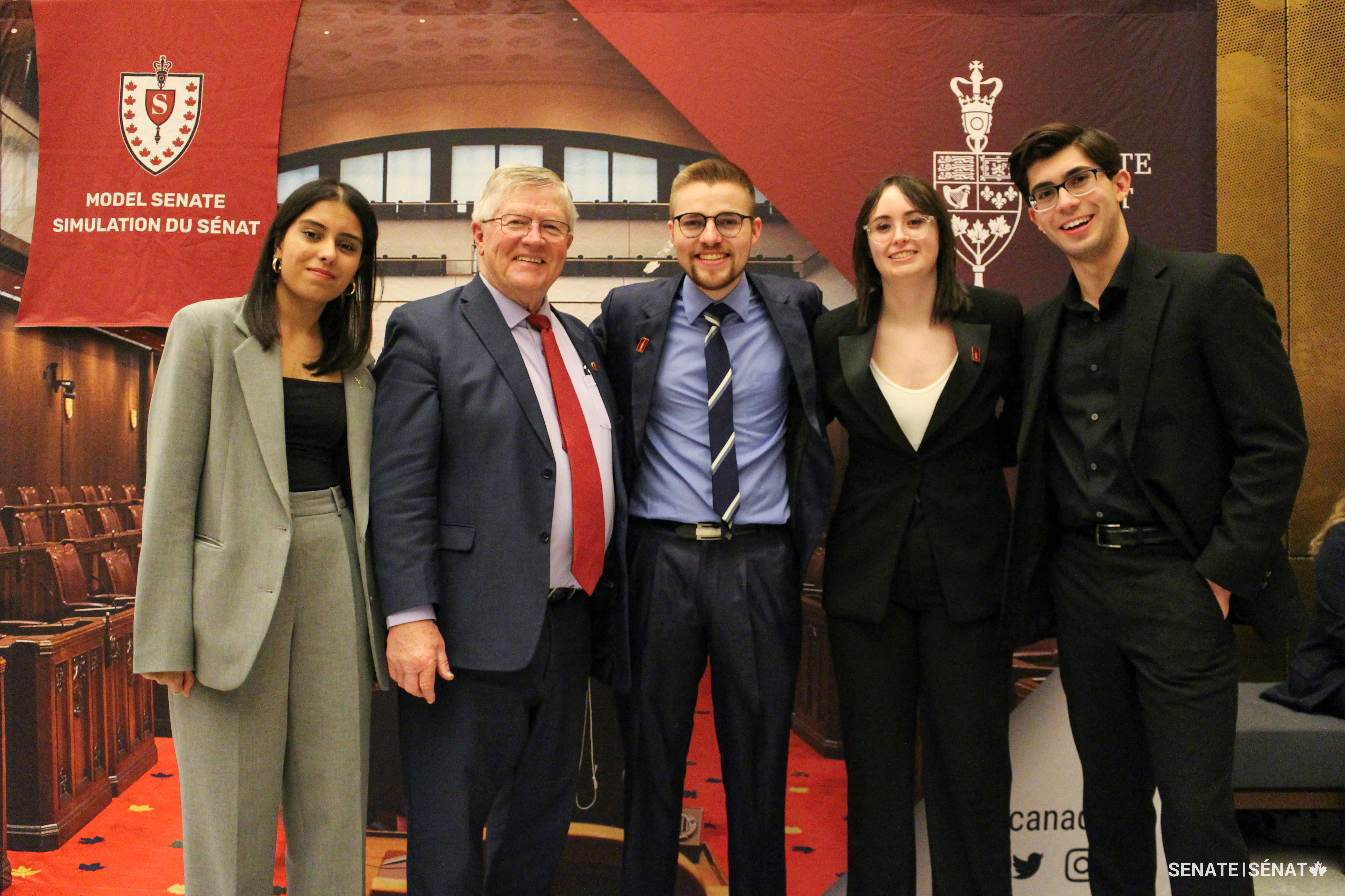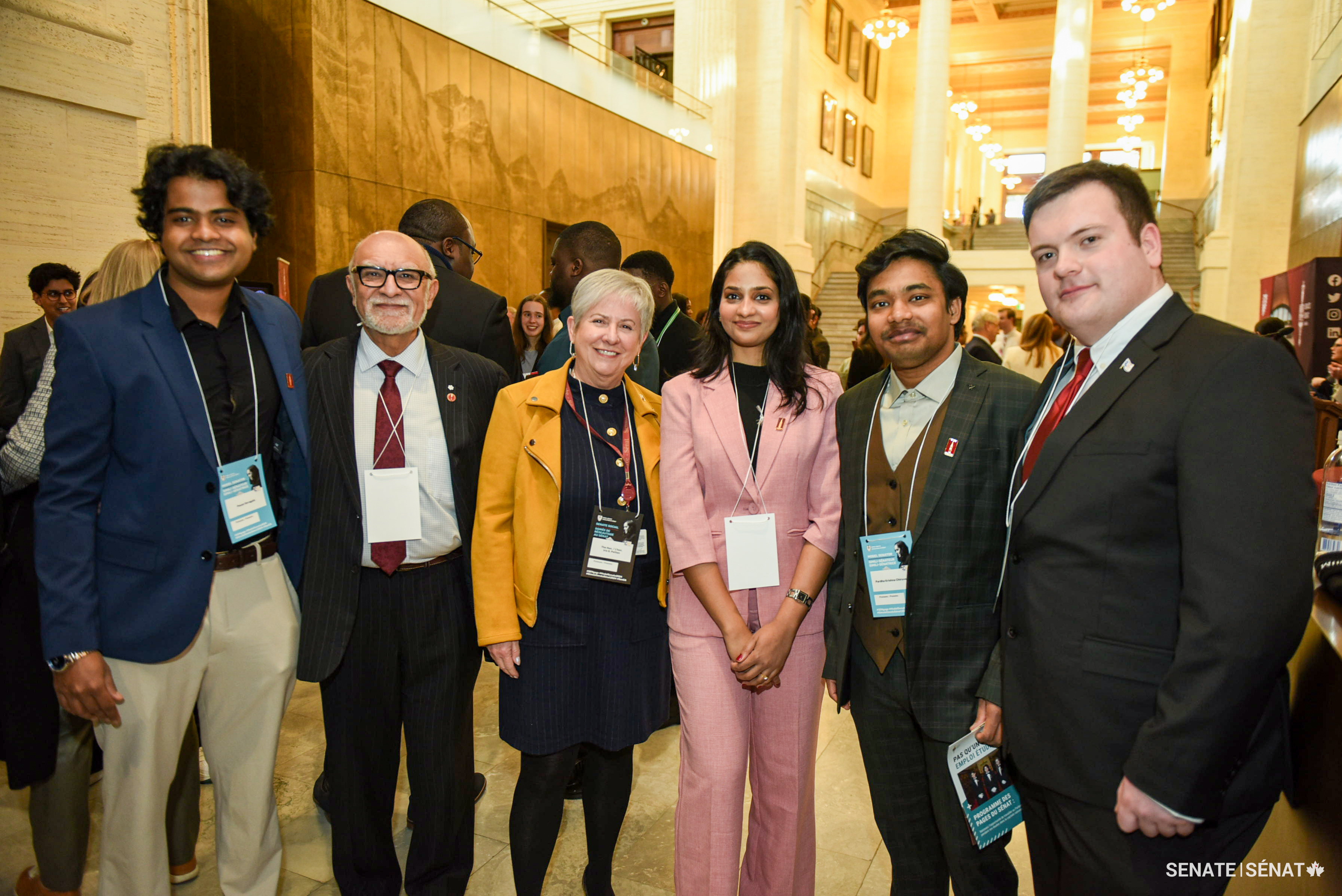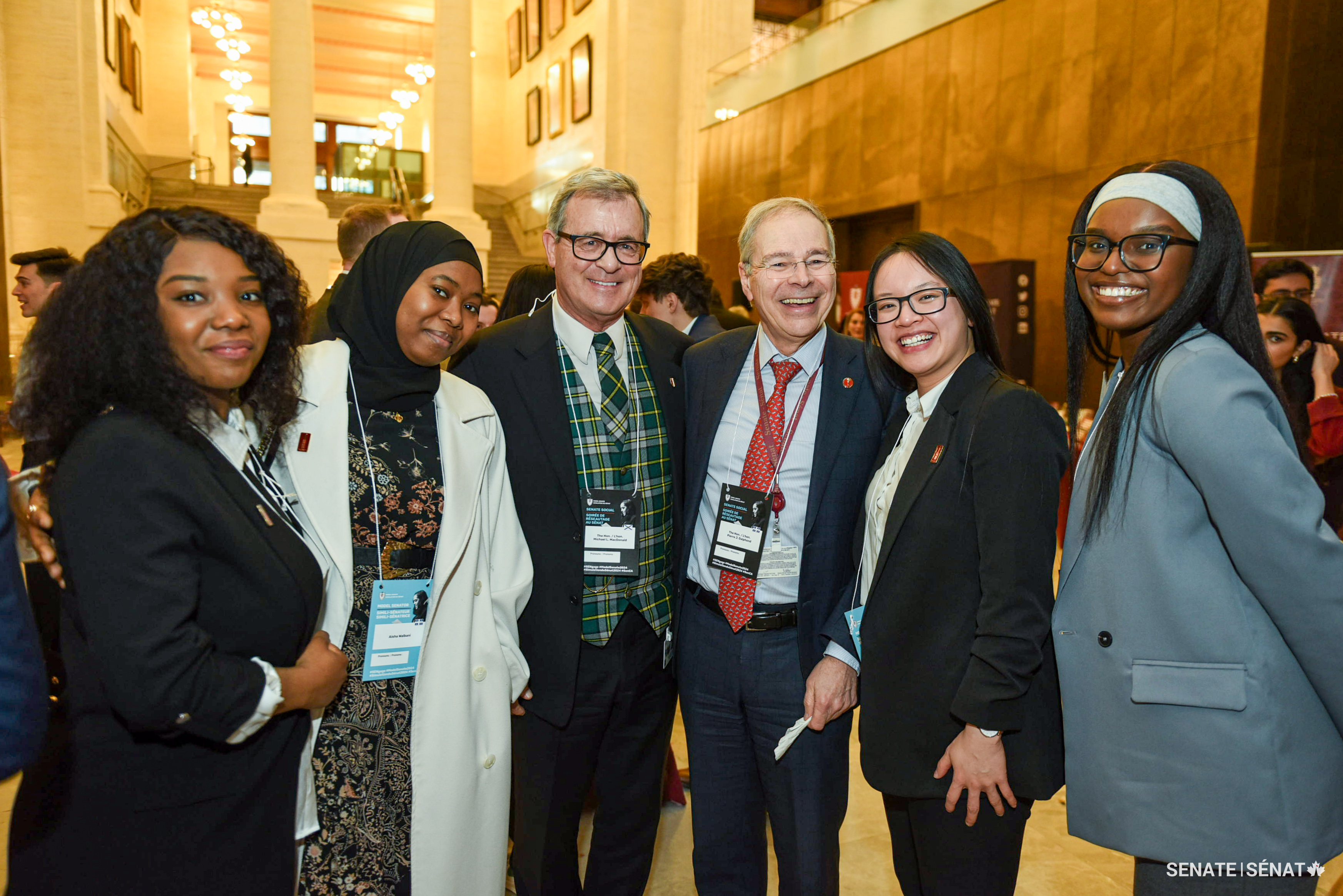 Senators Michael L. MacDonald, centre left, and Pierre J. Dalphond, centre right, pose with a group of model senators at the Senate Social.