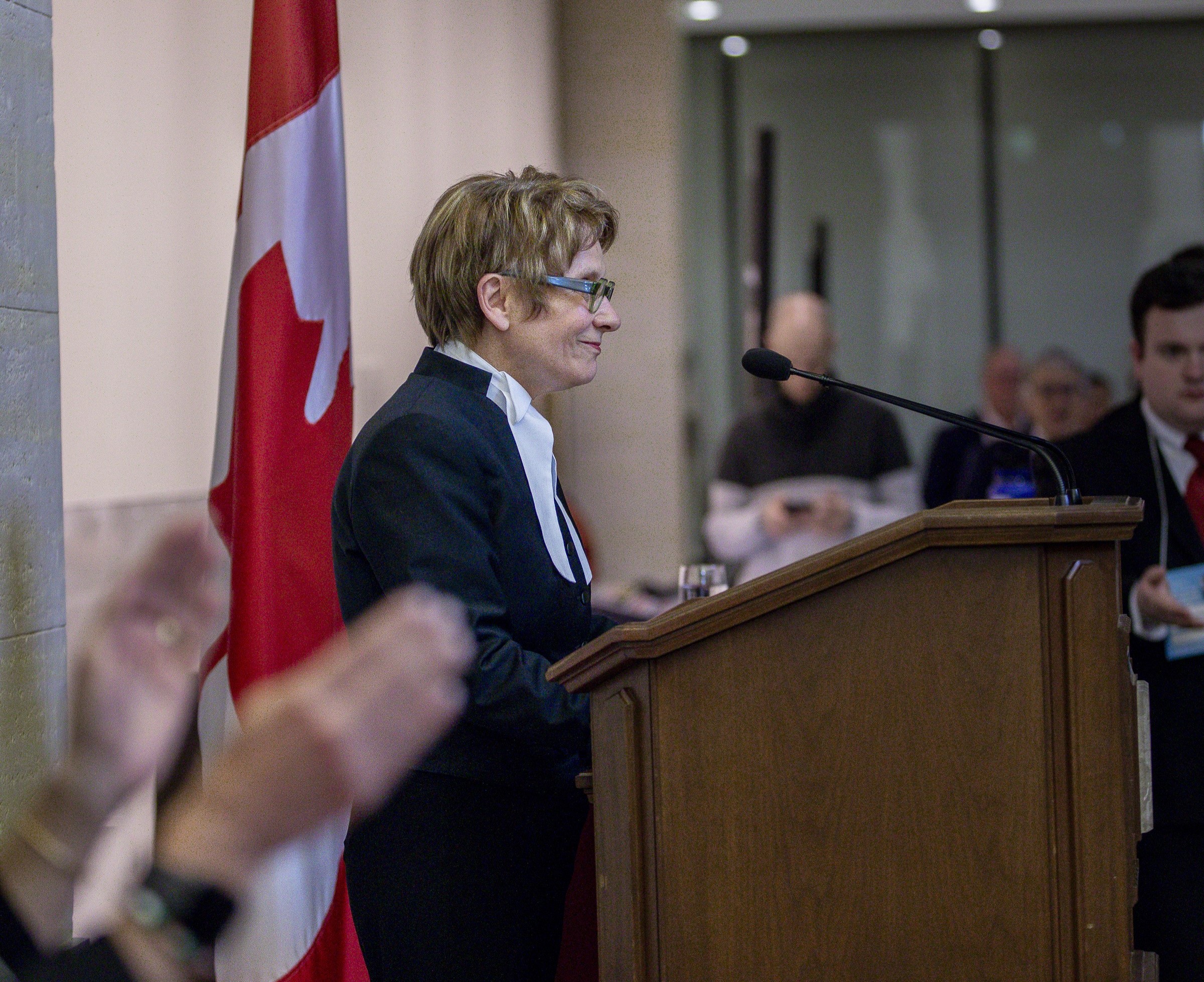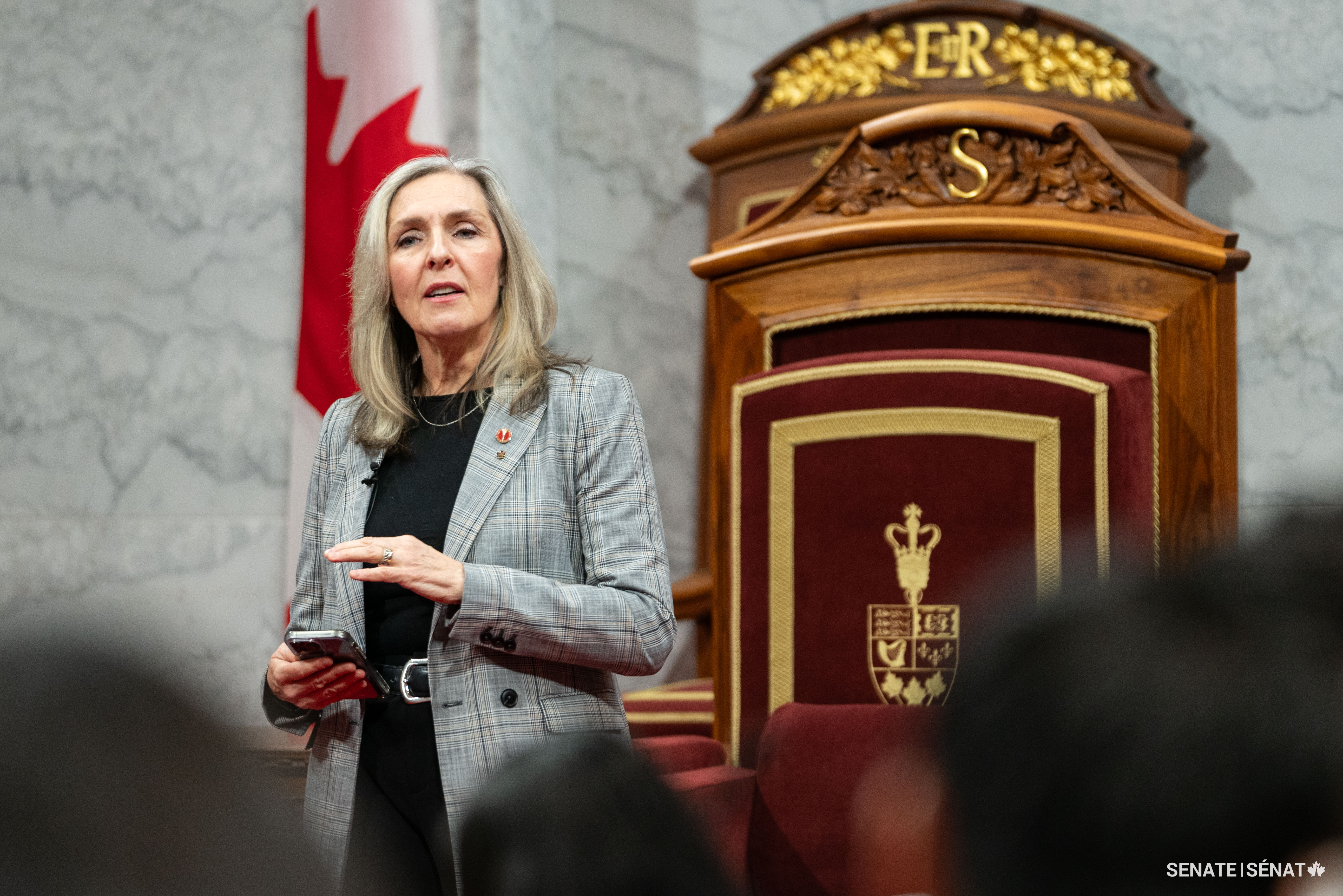 The 46th Speaker of the Senate, the Honourable Raymonde Gagné, encourages Model Senate participants to have fun and to debate their views with passion and respect. (Photo credit: Office of the Speaker of the Senate)