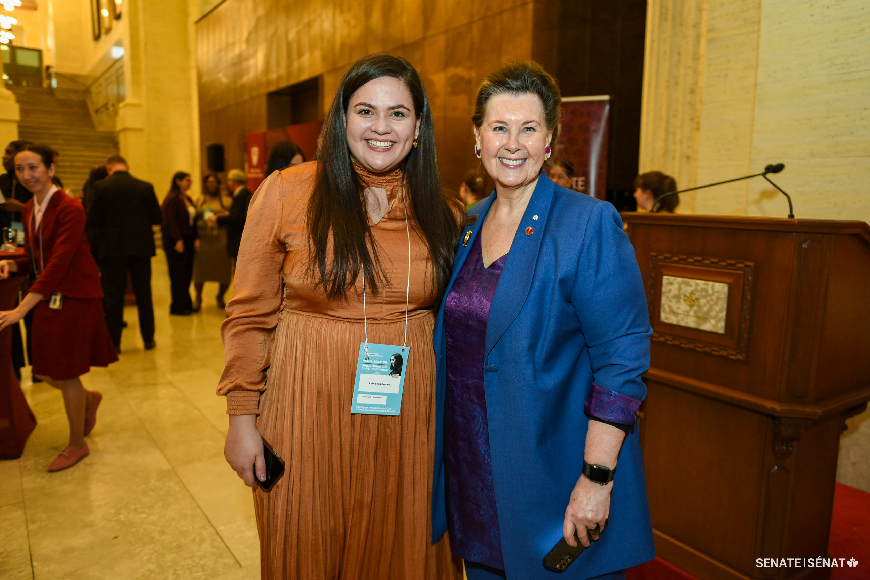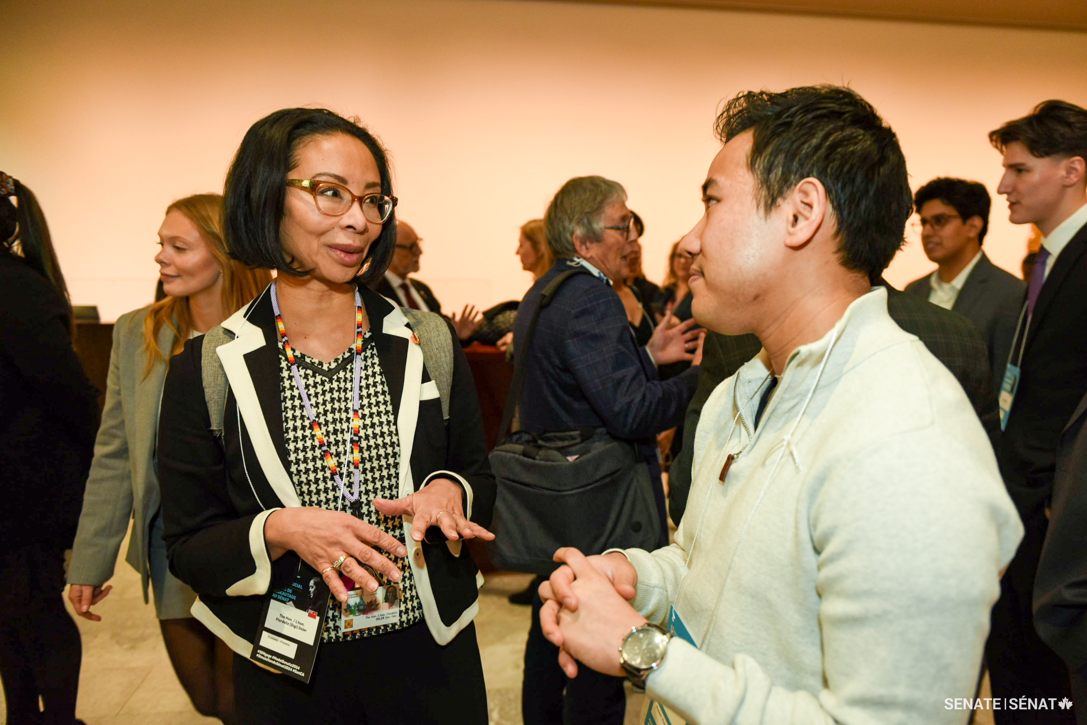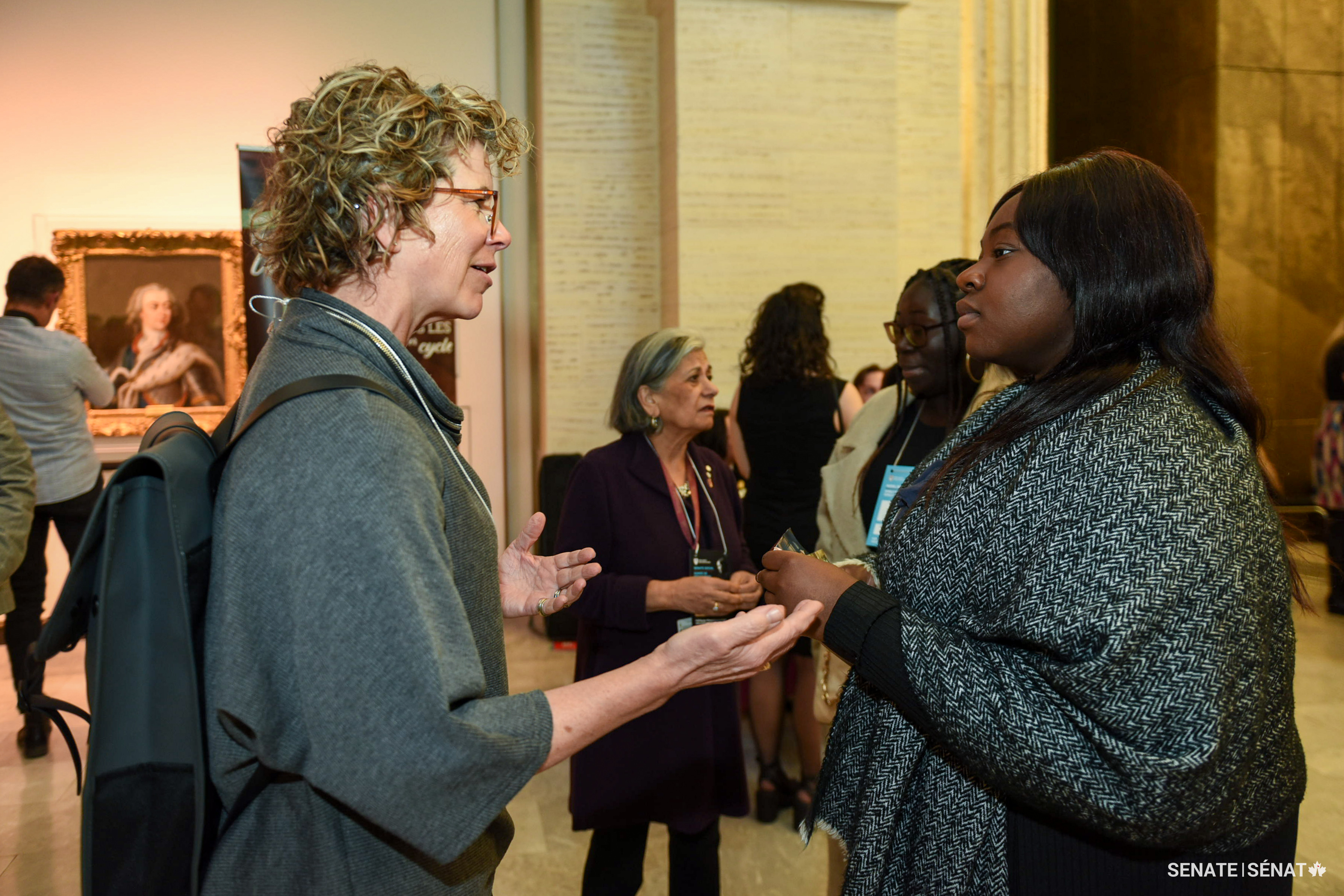 Senator Marilou McPhedran, right, connects with model senator Lais Silva Gomes at the Senate Social.