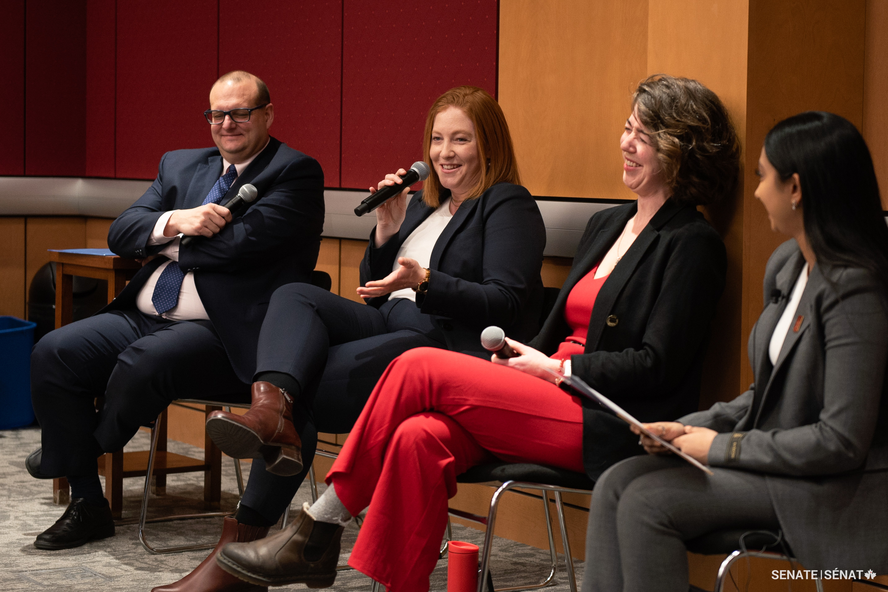 From left, Dan Charbonneau, Christina Cail and Katherine Sullivan — all senators’ staff — share their experiences with model senators during the “Pathways to Parliament” panel.