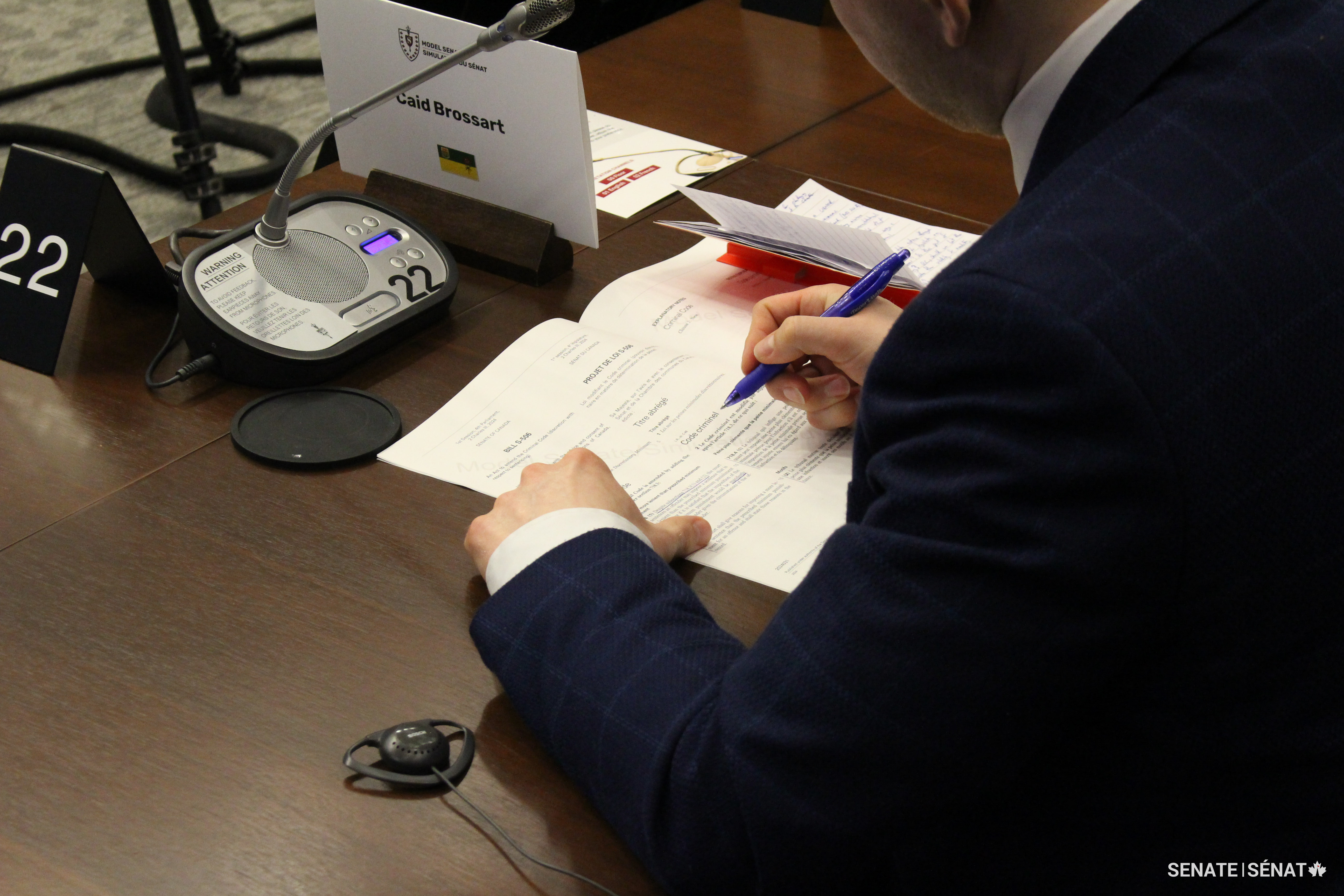 During a mock meeting of the Committee on Legal and Constitutional Affairs, model senator Caid Brossart takes notes on a copy of the bill being studied.