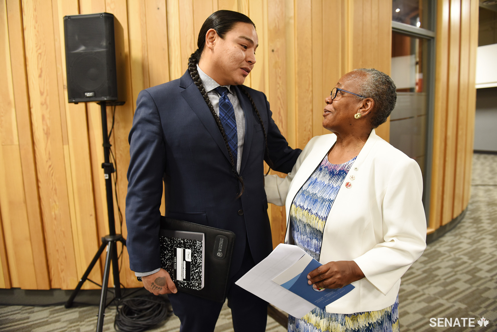 Panellist Ryan Beardy and Senator Bernard greet each other before a public hearing. Mr. Beardy was sent to a youth detention centre at age 13 and spent years in and out of the criminal justice system. He is now in his 30s and in his second year at the University of Winnipeg studying political science and conflict resolution.
