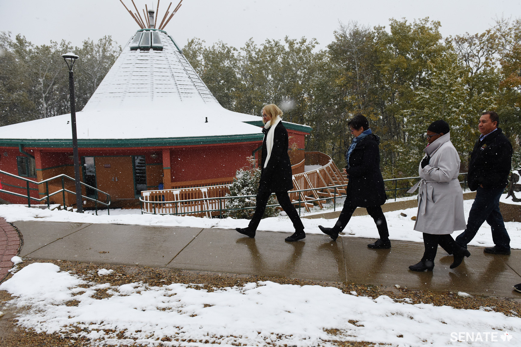 Senator Jane Cordy, Senator Kim Pate, Senator Wanda Thomas Bernard and Chief Alvin Francis walk past a spiritual lodge at the Okimaw Ohci Healing Lodge. Located on lands belonging to the Nekaneet First Nation, it was designed to house minimum, medium and maximum-security prisoners.