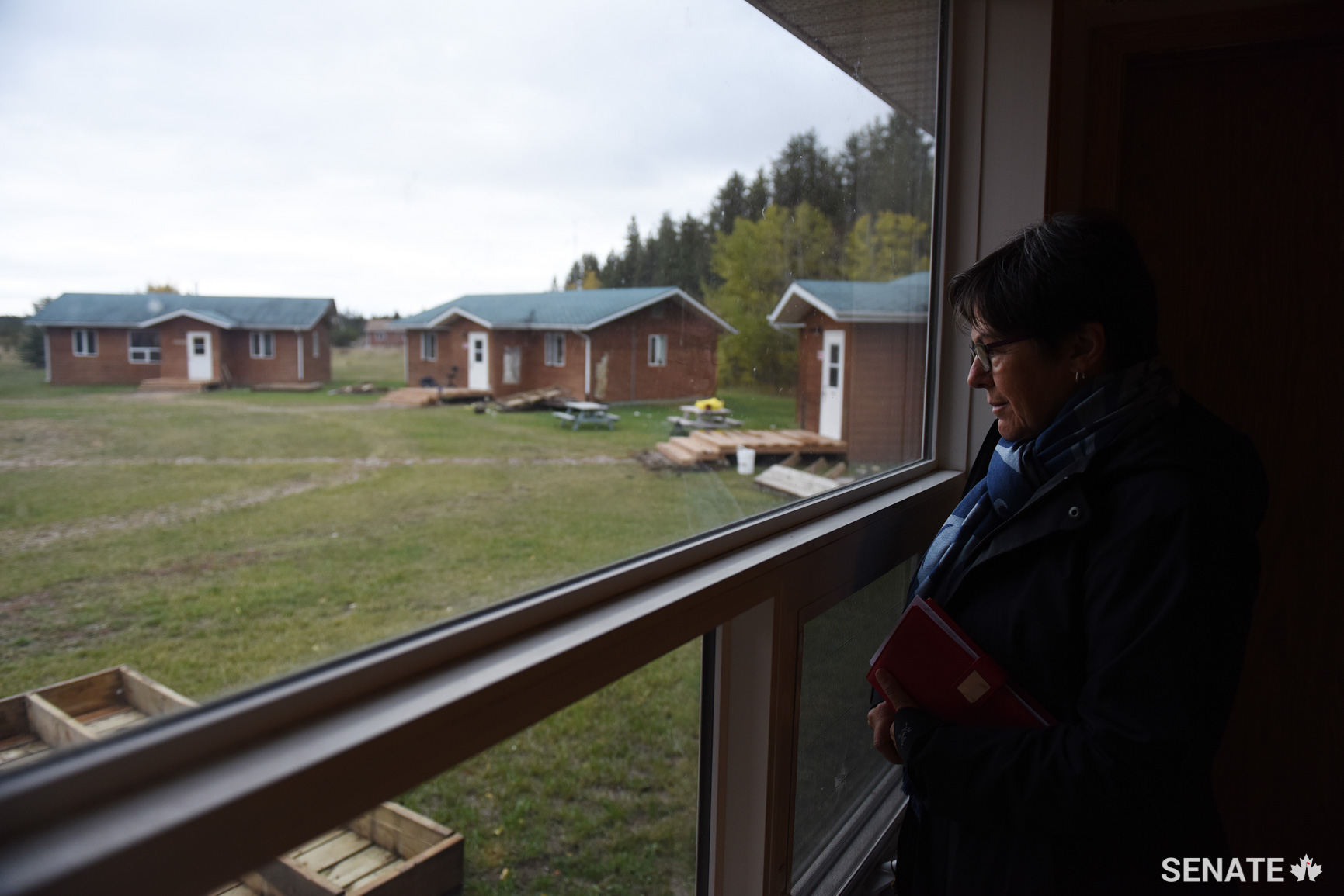 Senator Kim Pate looks out onto the grounds of the Prince Albert Grand Council Spiritual Healing Lodge, which includes six cabins, summer and winter sweat lodges, a room dedicated for healing circles, and an administration room. Prisoners at the healing lodge are referred to as “relatives” by staff.