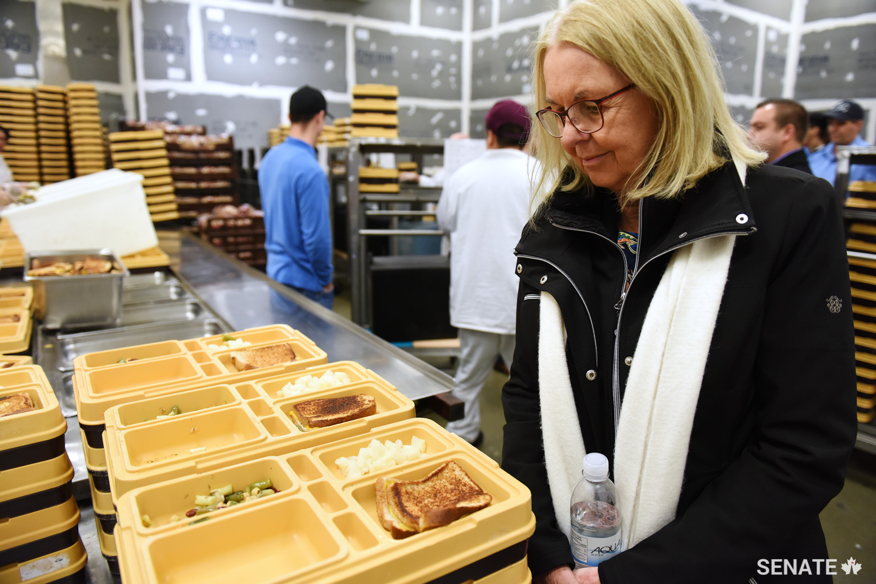 Senator Cordy inspects the day’s lunch offering: grilled cheese, salad and pears. Small portion size is a regular complaint at the prison, members of the prisoners’ committee told senators.