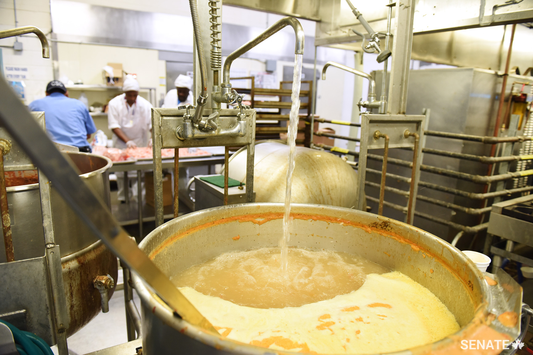 A tap flows into a large soup pot. A prisoner said one of the cooks used to wash his hands under the tap as it poured into the soup.