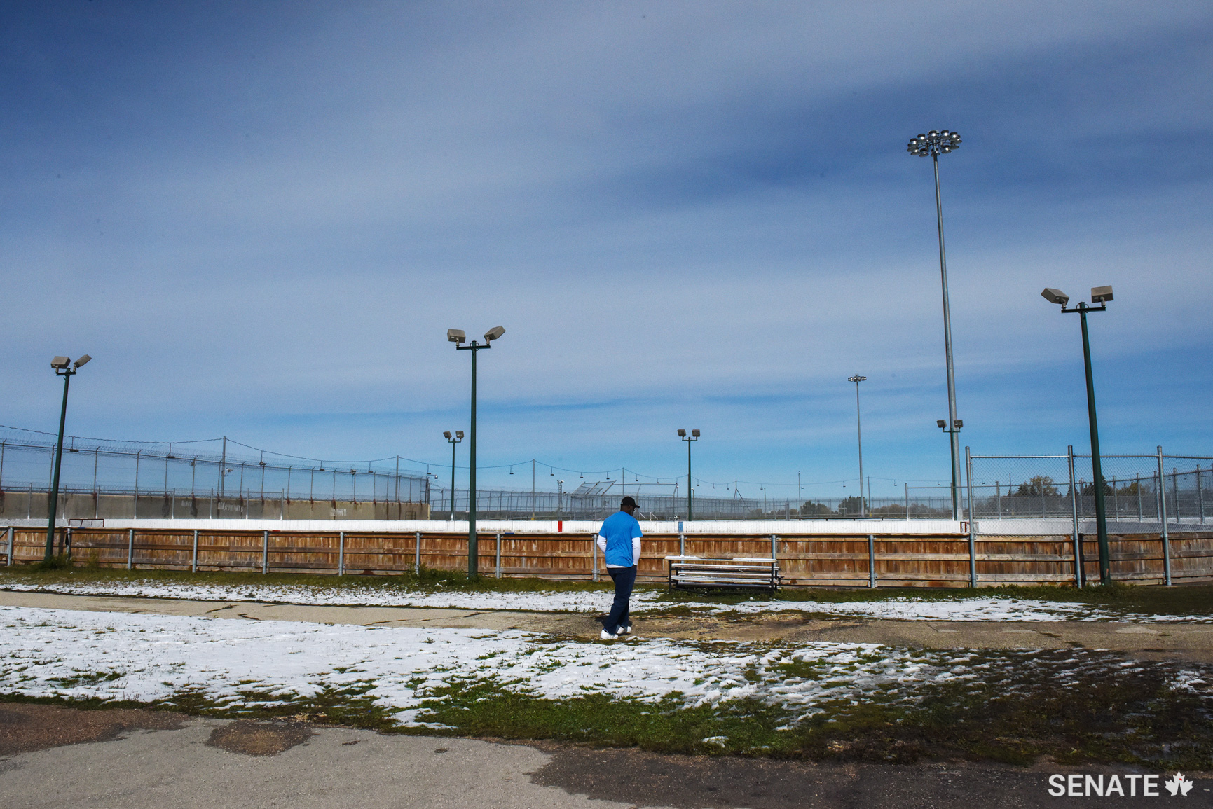 A prisoner walks in an outdoor recreation area used as an ice rink for hockey in winters past.