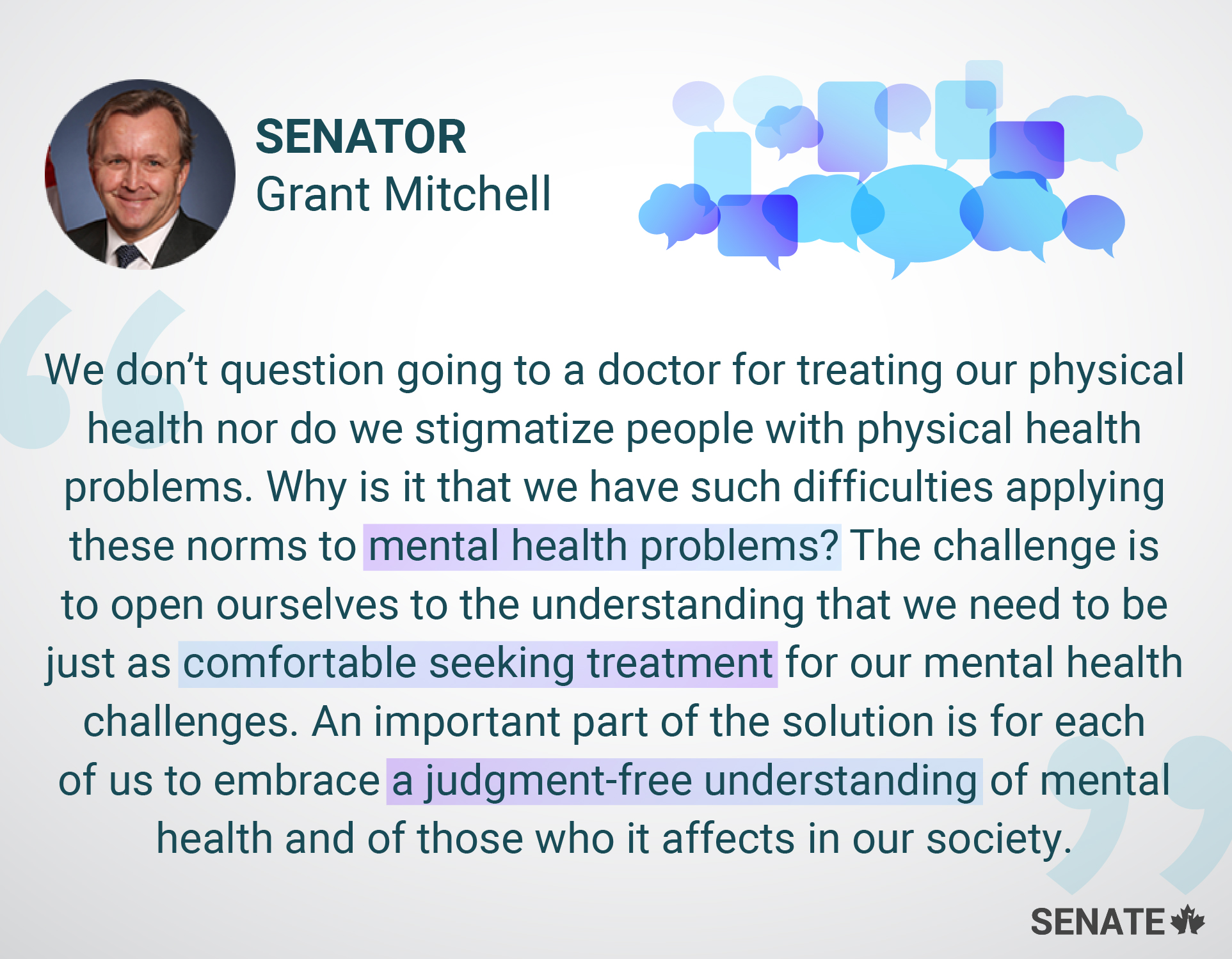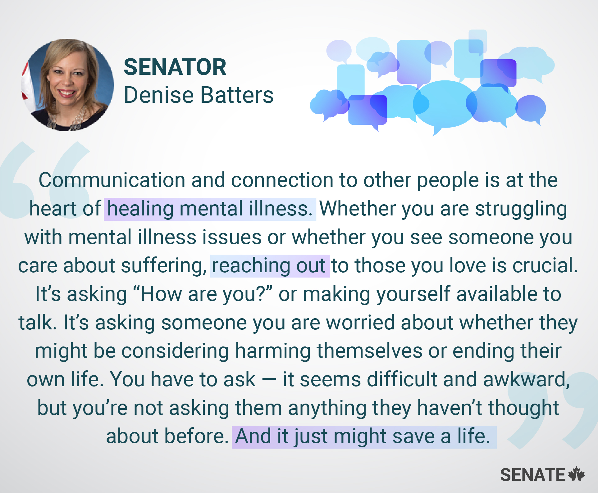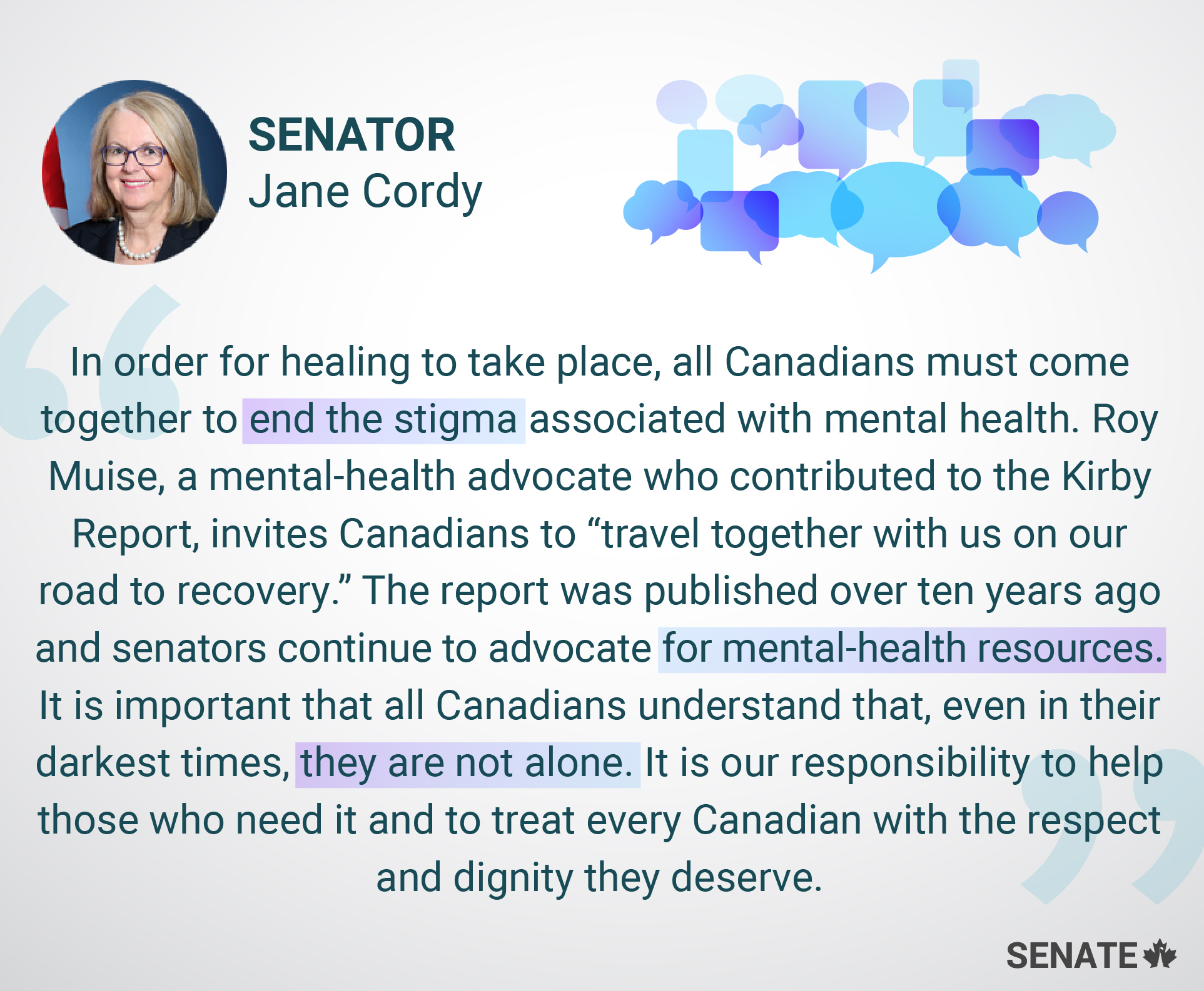 Senators prove their commitment to this important social issue through their continued work on legislation, reports and advocacy relating to mental health.