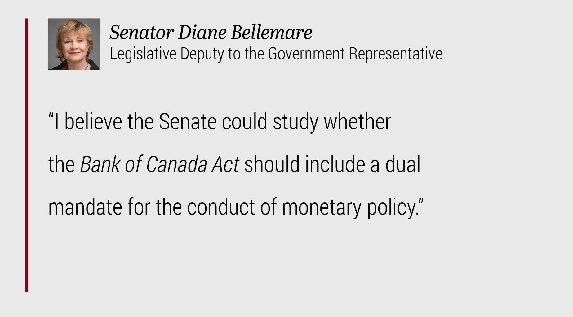 I believe the Senate could study whether the Bank of Canada Act should include a dual mandate for the conduct of monetary policy just as the United States, Australia and more recently, New Zealand, are doing.