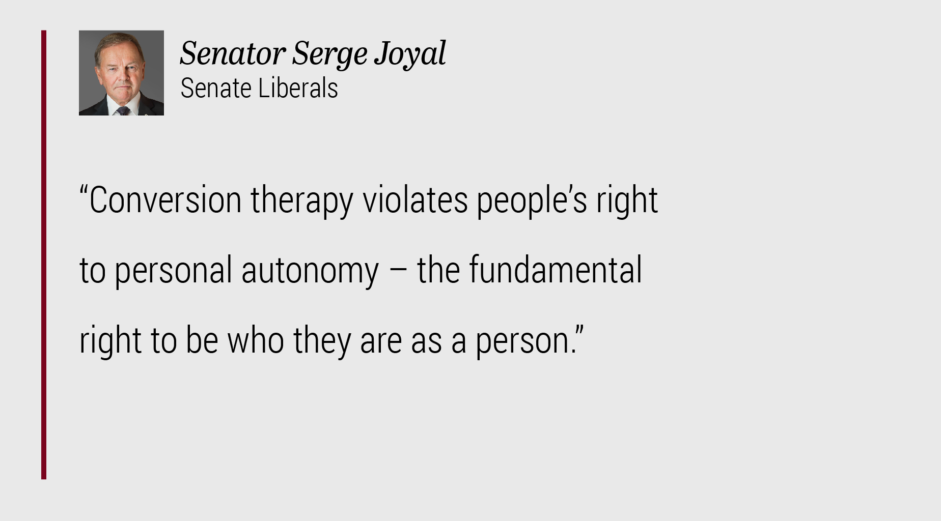 The Canadian Charter of Rights and Freedoms ensures that we are all entitled to the same measure of equality and dignity. But conversion therapy violates a person’s right to personal autonomy, to their physical and psychological integrity — the fundamental right of a person to be who he or she is. Conversion therapy contravenes a person’s right to self-determination. Conversion therapy can permanently harm a person and can destroy lives.