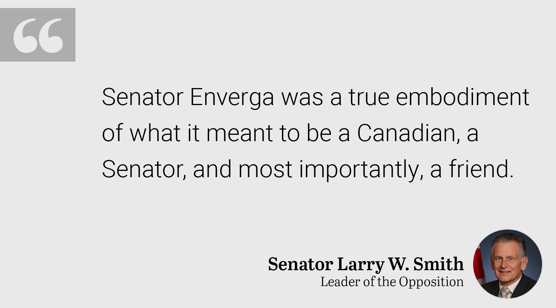 Senator Enverga will be greatly missed by all who had the pleasure of knowing him, and equally by those who were not fortunate enough to cross his path. He was a man of great conviction and a hardworking parliamentarian. Through his efforts in the Chamber and across Canada, Senator Enverga had earned the respect and admiration of his colleagues and fellow citizens.