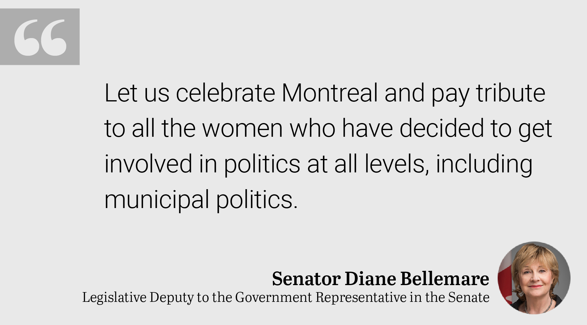 Let us celebrate Montreal and pay tribute to all the women who have decided to get involved in politics at all levels, including municipal politics.