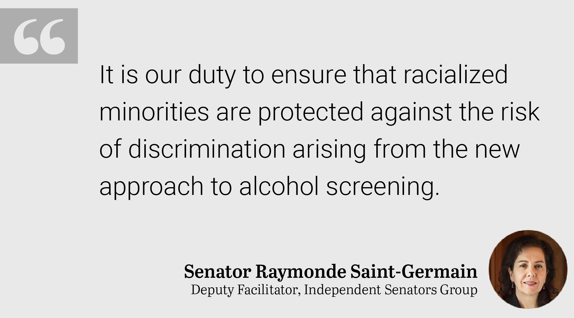 Eliminating the requirement to have reasonable grounds for suspicion gives police arbitrary powers that run the risk of increased racial profiling. It is our duty to ensure that racialized minorities are protected against the risk of discrimination arising from the new approach to alcohol screening.