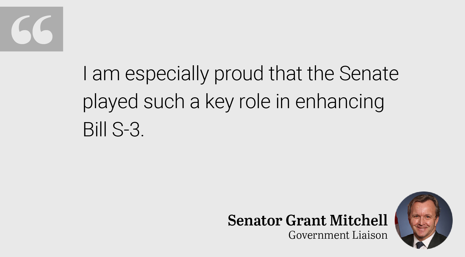 For its efforts, the Senate has been recognized by the Hon. Carolyn Bennett, Minister of Crown-Indigenous Relations and Northern Affairs, for its diligence and willingness to work with the government and across party and caucus lines to strengthen Bill S-3.