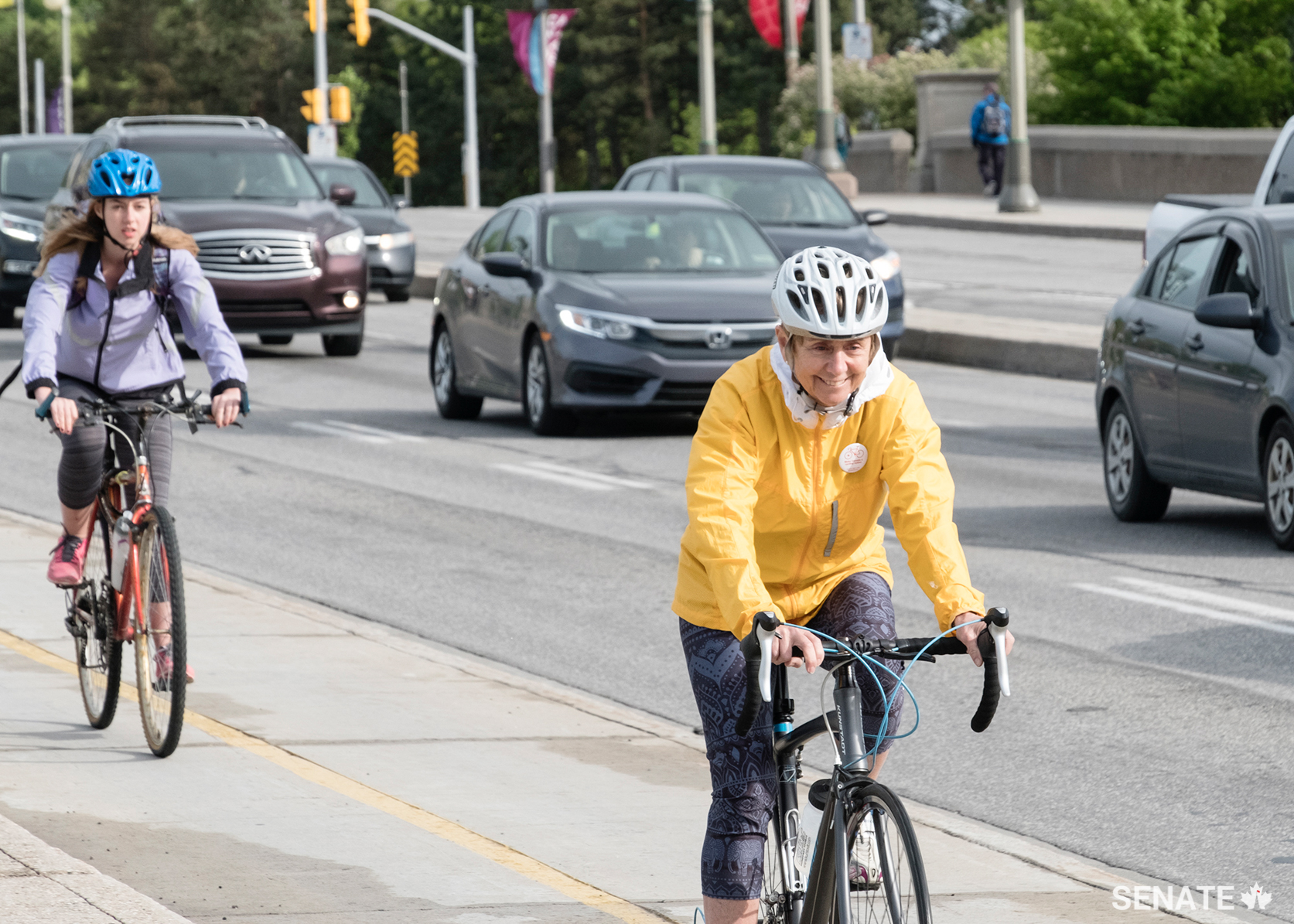 Senator Nancy Greene Raine takes part in Bike Day on the Hill in June 2017.