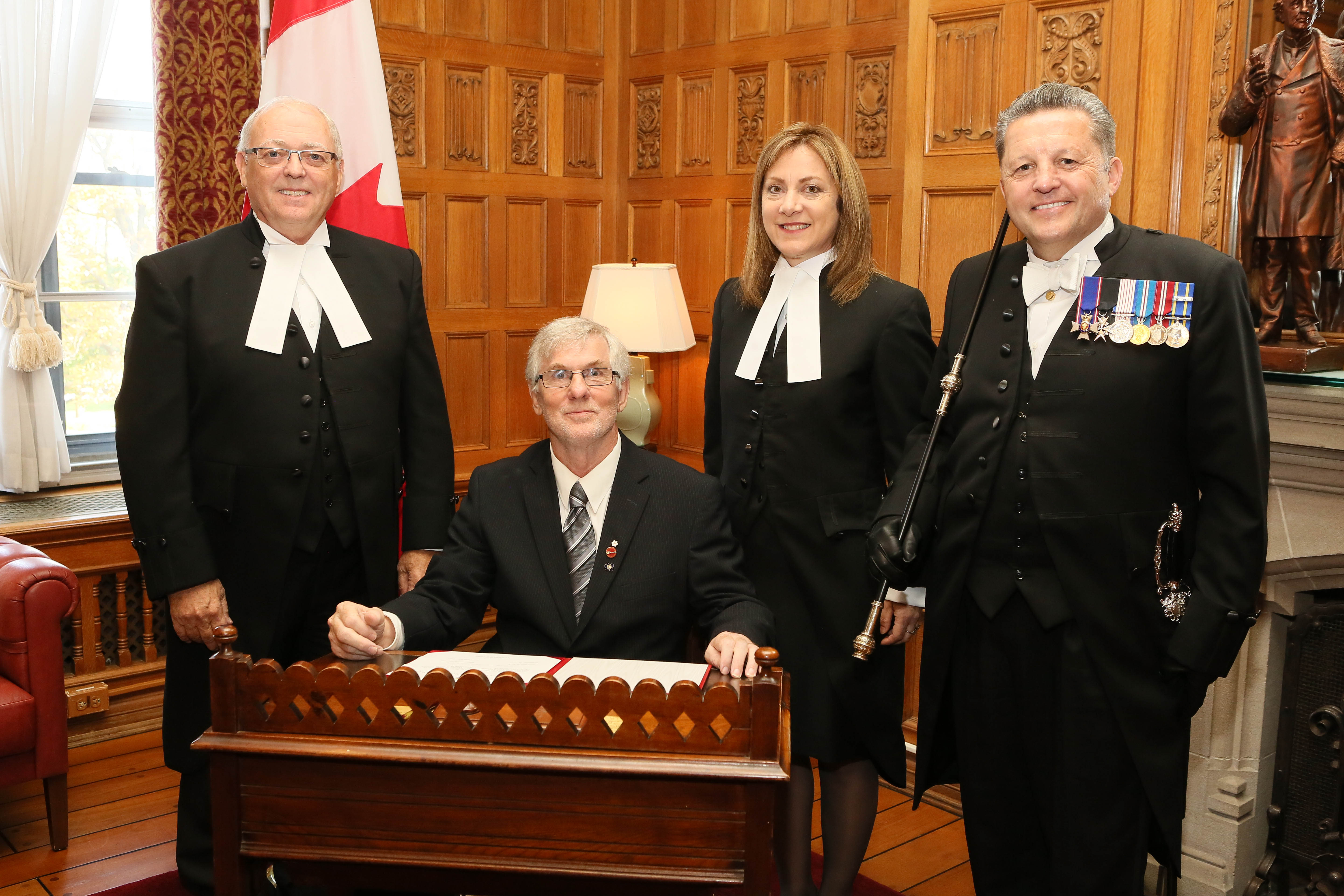 Senator David Adams Richards prepares to join the Red Chamber in 2017 accompanied by then-Senate speaker George J. Furey left, then-Senate clerk Nicole Proulx and Usher of the Black Rod J. Greg Peters.