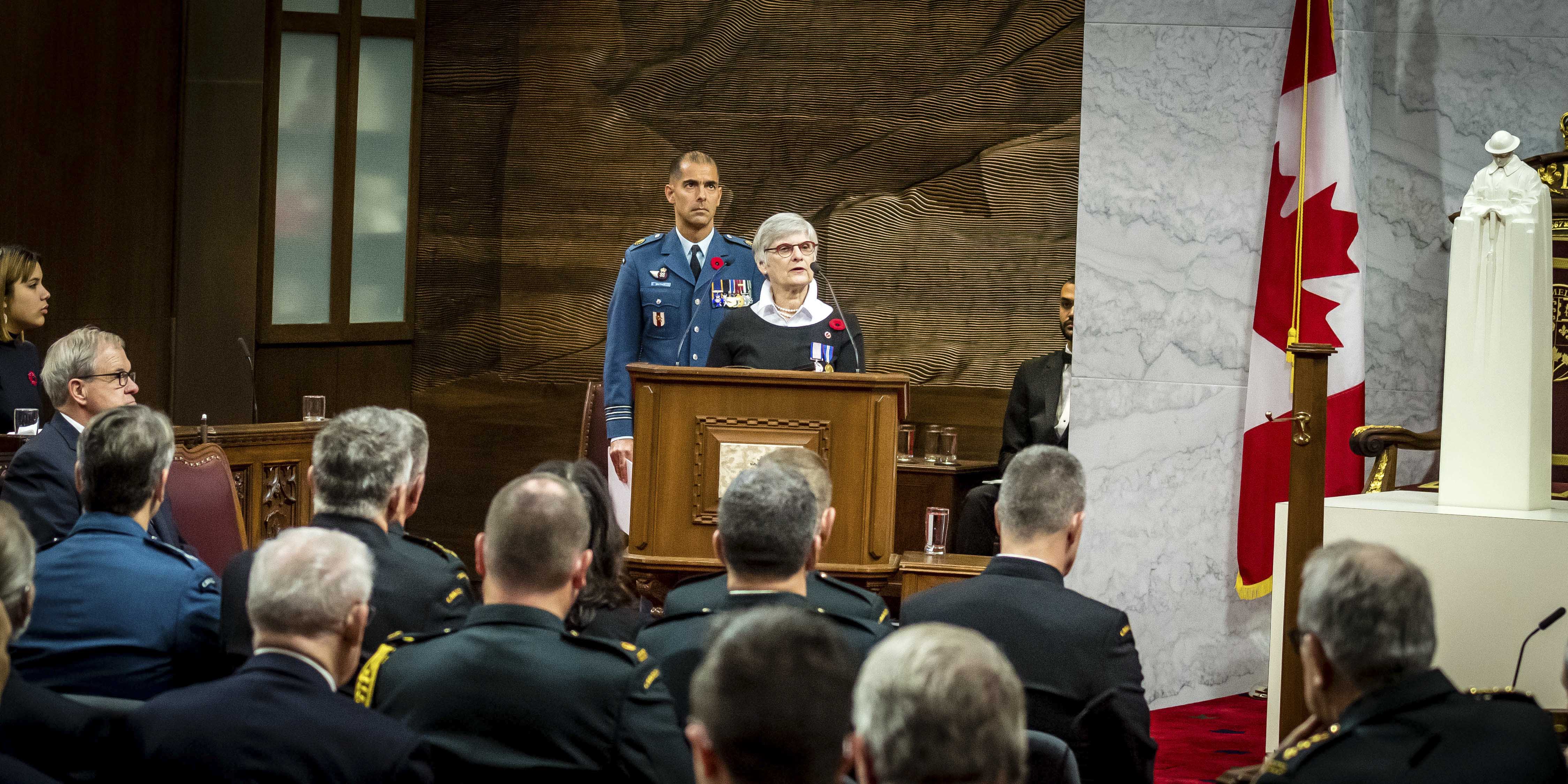 Senator Patricia Bovey delivers remarks as acting Speaker of the Senate during a 2019 Remembrance Day ceremony in the Red Chamber. (Photo credit: Office of the Speaker of the Senate)
