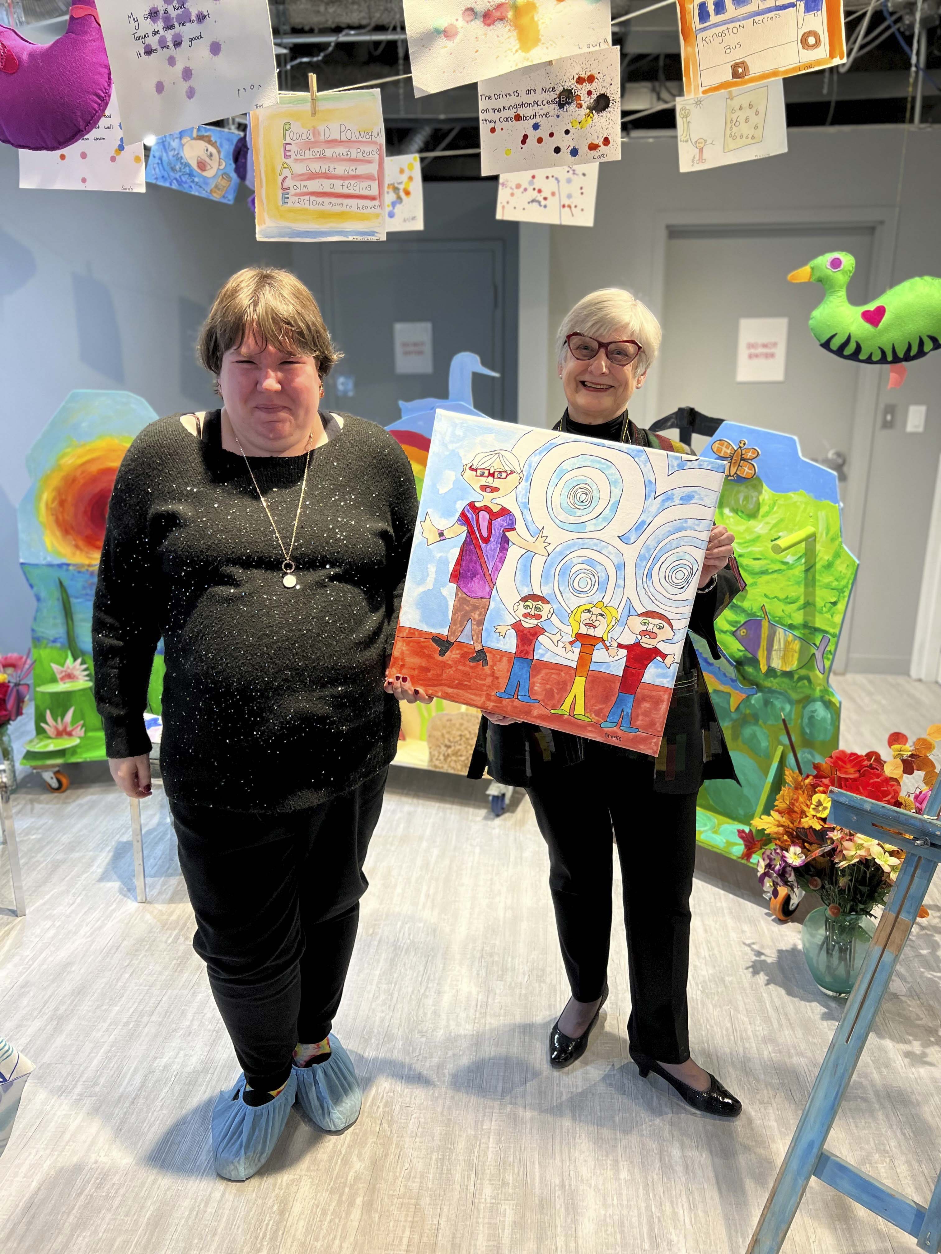 Artist Brooke D. presents Senator Bovey with a portrait she painted of the senator in March 2023 at the H’art Centre, which provides arts, music, dance and theatre programming to adults with disabilities in Kingston, Ontario. (Photo credit: Office of Senator Patricia Bovey)