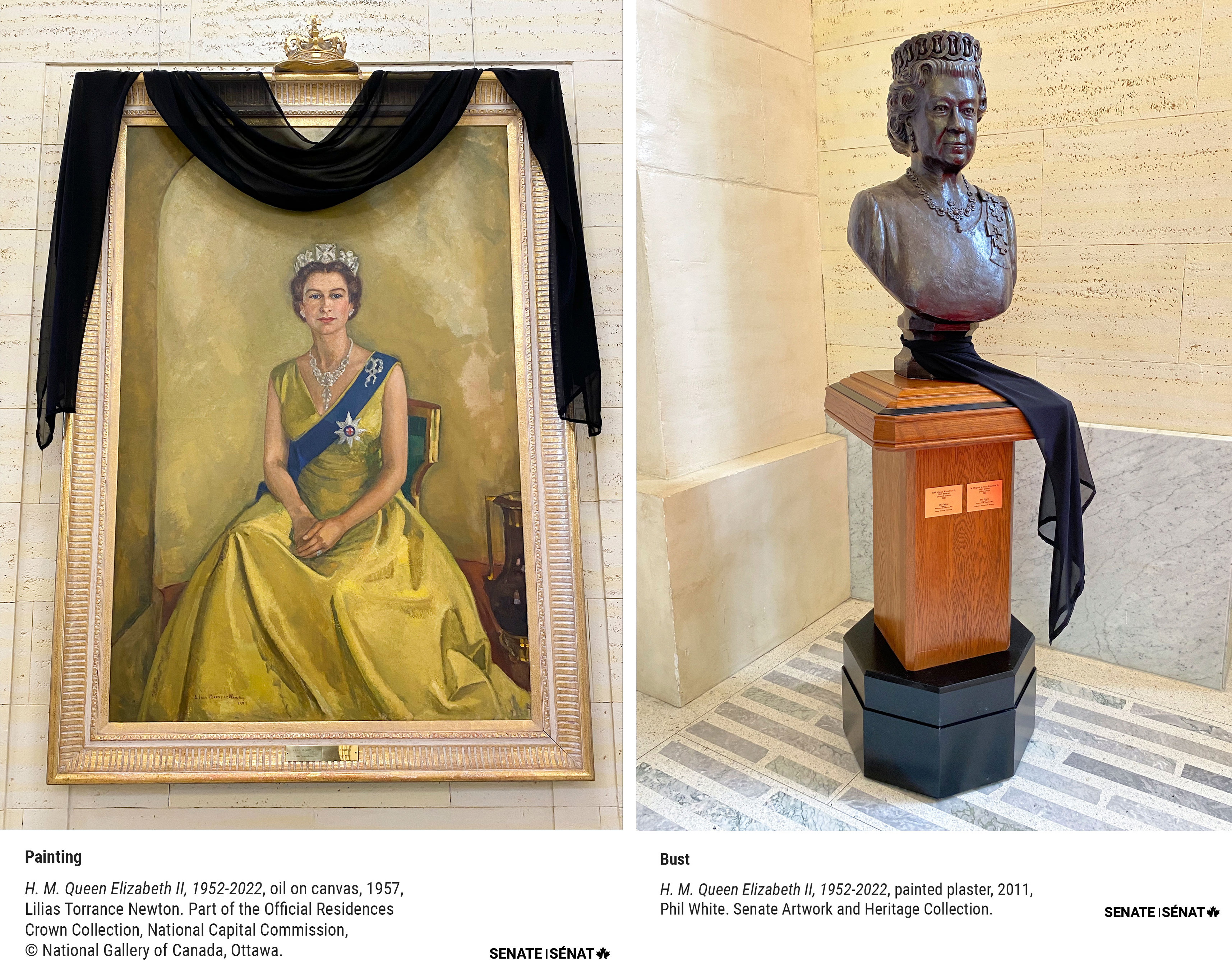 Symbols of mourning have been affixed to the portrait and bust of the Queen inside the Senate of Canada Building.