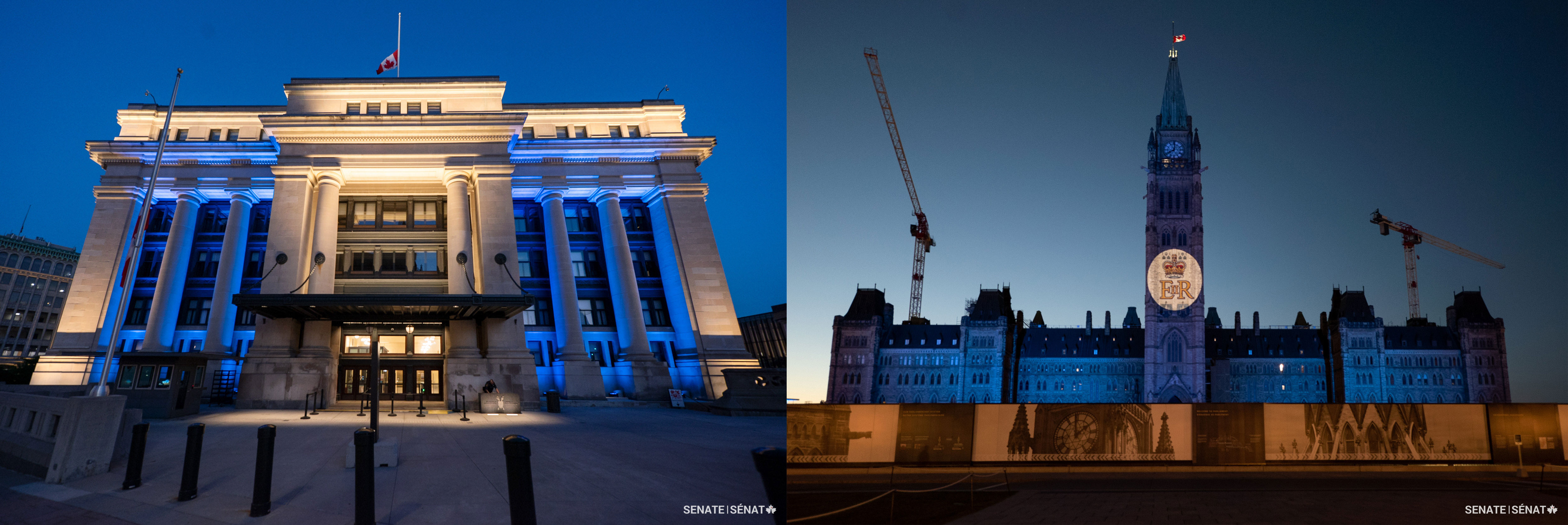 From dusk until midnight throughout the mourning period, the Senate of Canada Building and the Peace Tower are bathed in royal blue as a tribute to the Queen of Canada.