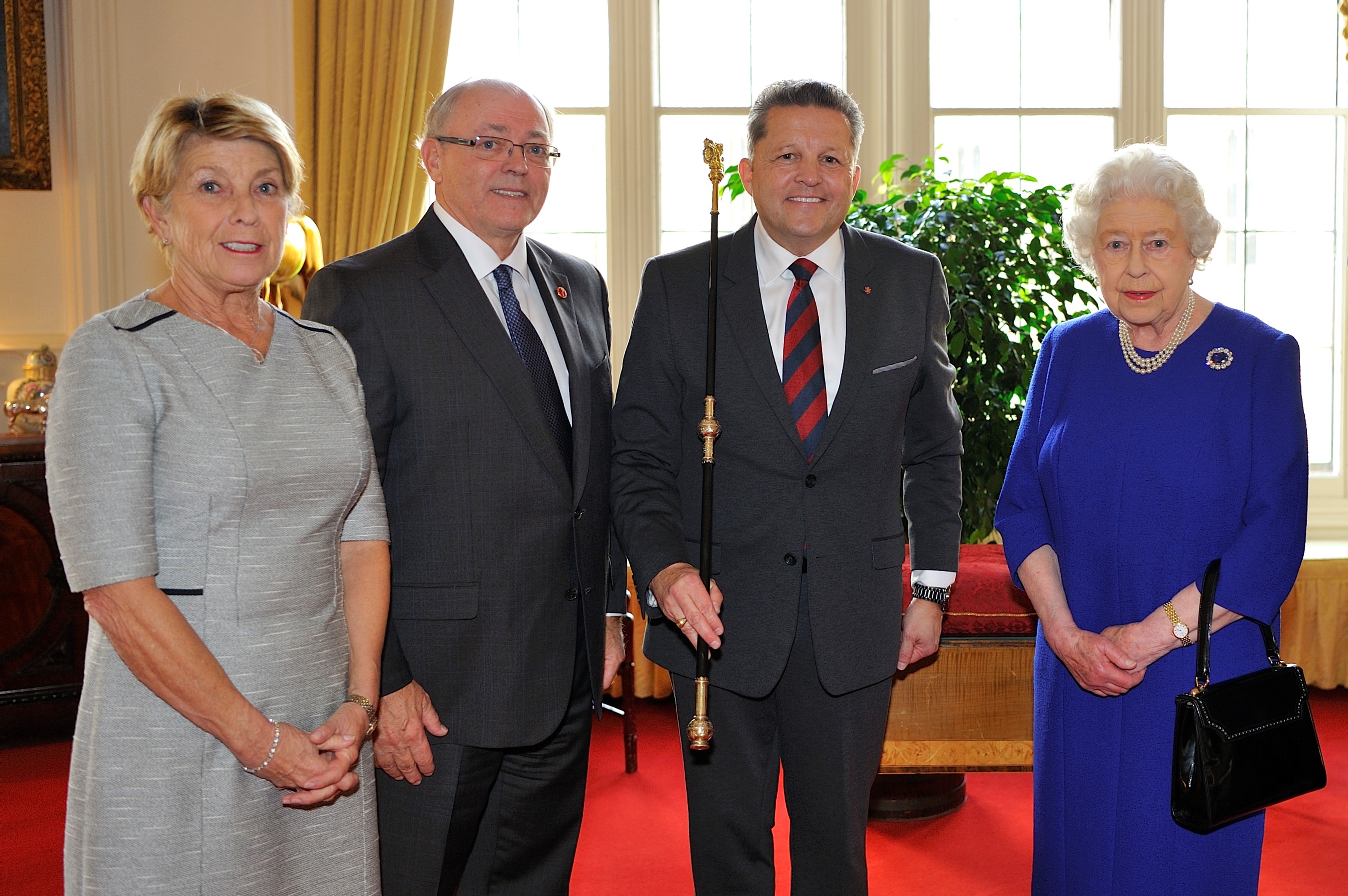 The Queen meets with Speaker of the Senate George J. Furey, second from left, his wife Karen Furey and Usher of the Black Rod J. Greg Peters in 2016.