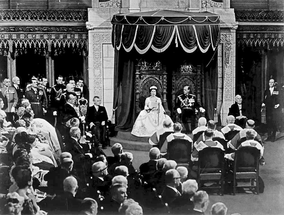 In the Senate Chamber with His Royal Highness, Prince Philip, the Duke of Edinburgh beside her, Queen Elizabeth reads the Speech from the Throne to open Canada’s 23rd Parliament on October 14, 1957. (Photo credit: Library and Archives Canada)