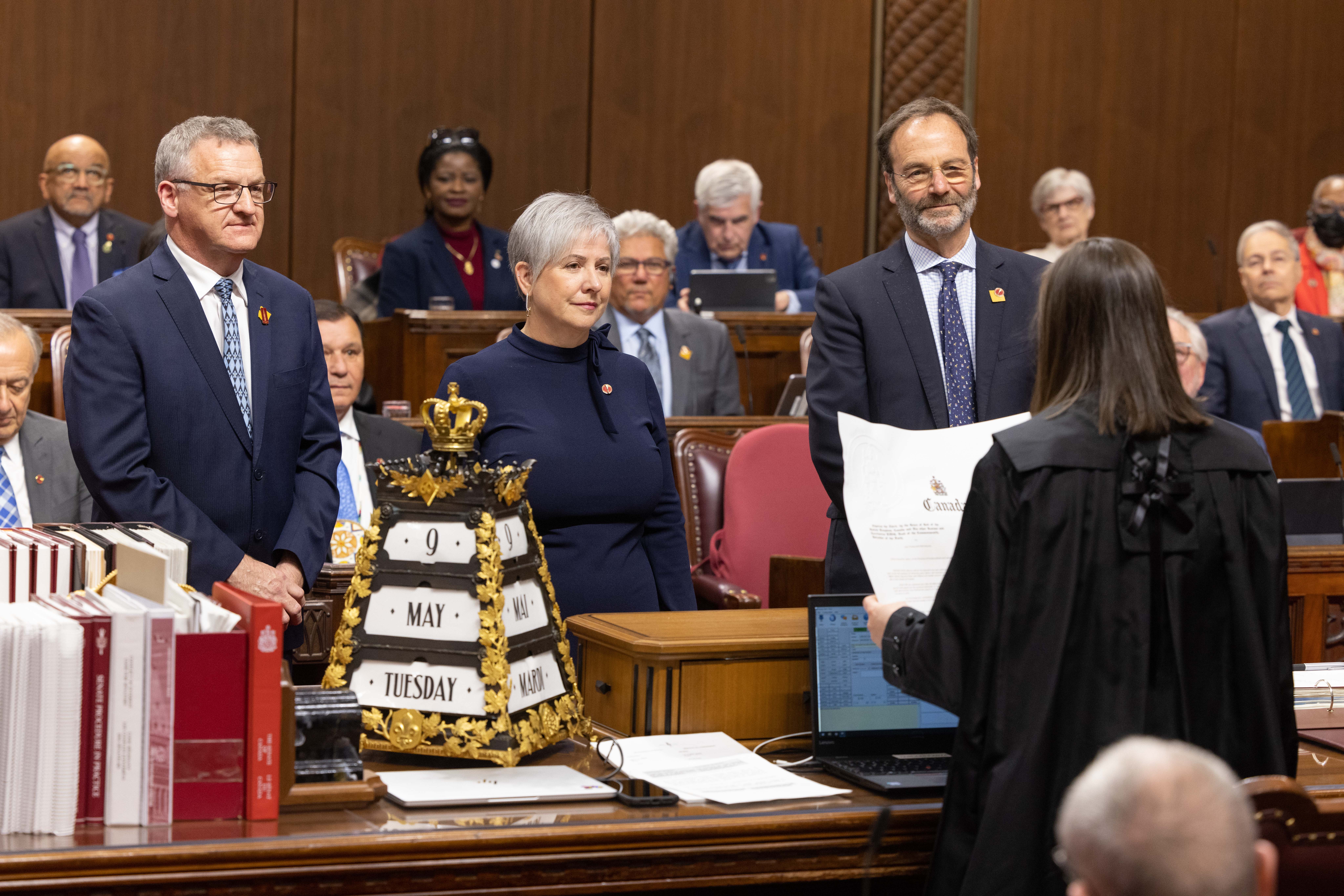 Senator Iris G. Petten, centre, is sworn in to the Red Chamber on May 9, 2023, as senators Fabian Manning, left, and Marc Gold look on.