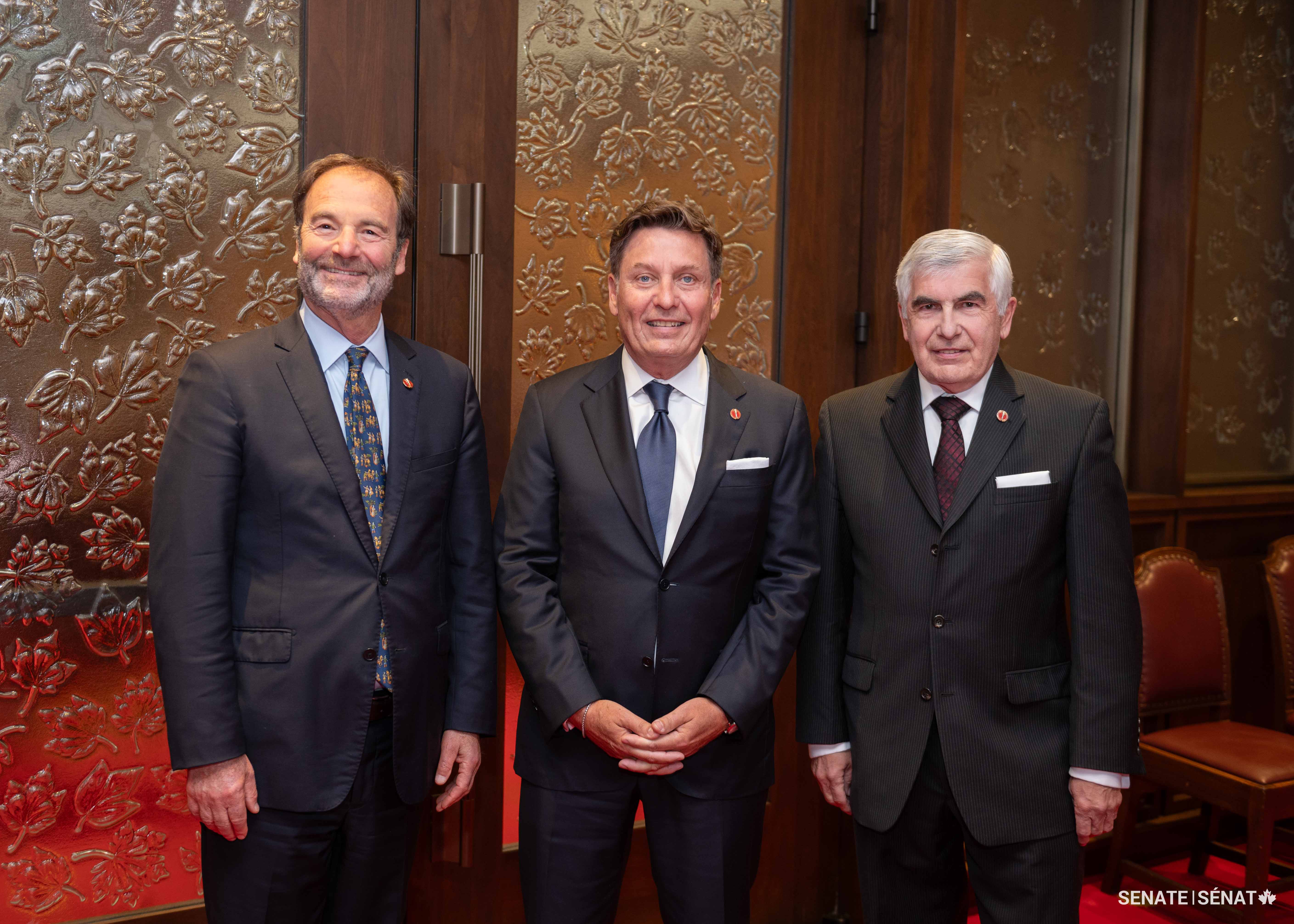 From left, senators Marc Gold, Pierre Moreau and Clément Gignac pose outside the Red Chamber ahead of Senator Moreau’s swearing-in ceremony on September 25, 2024.