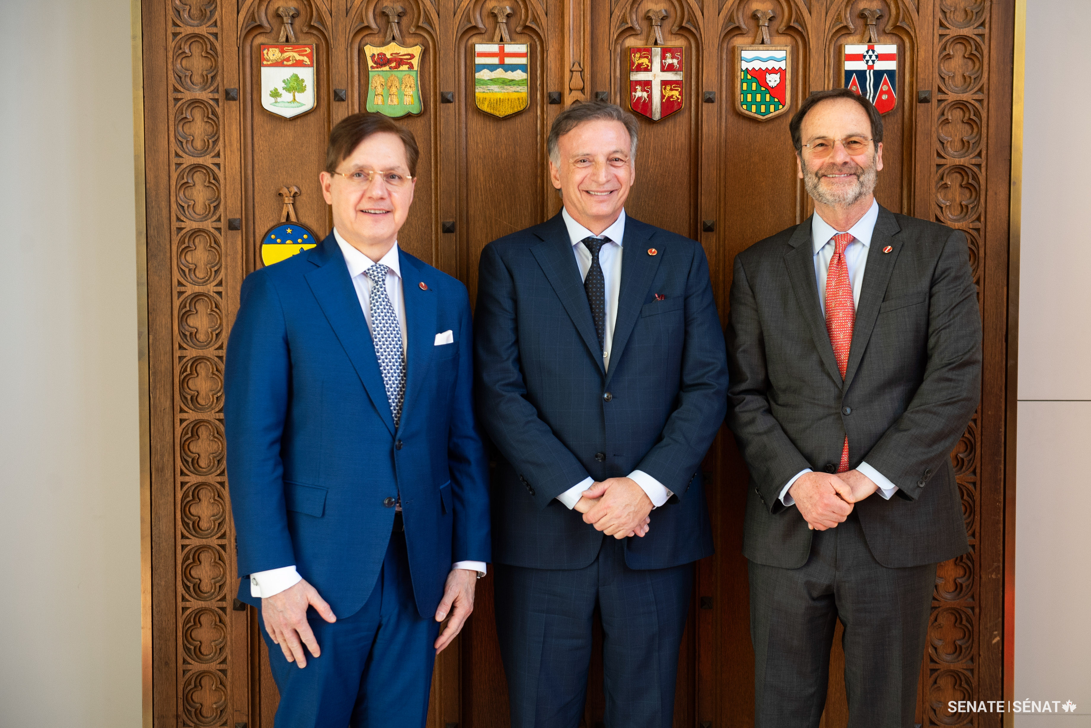 Senator Charles S. Adler, centre, stands outside the Red Chamber ahead of his swearing-in ceremony on September 17, 2024, with senators Paula Simons and Marc Gold.