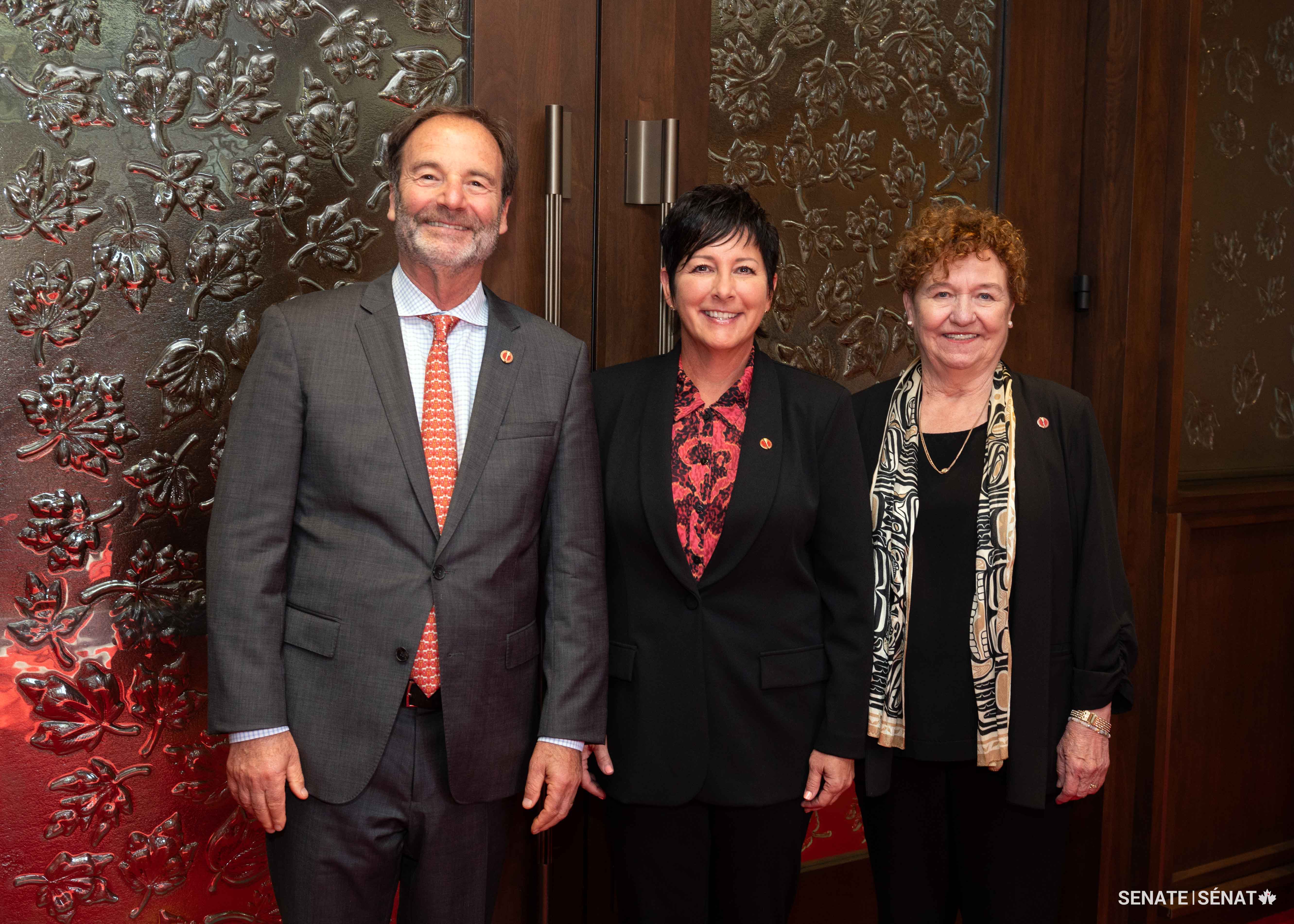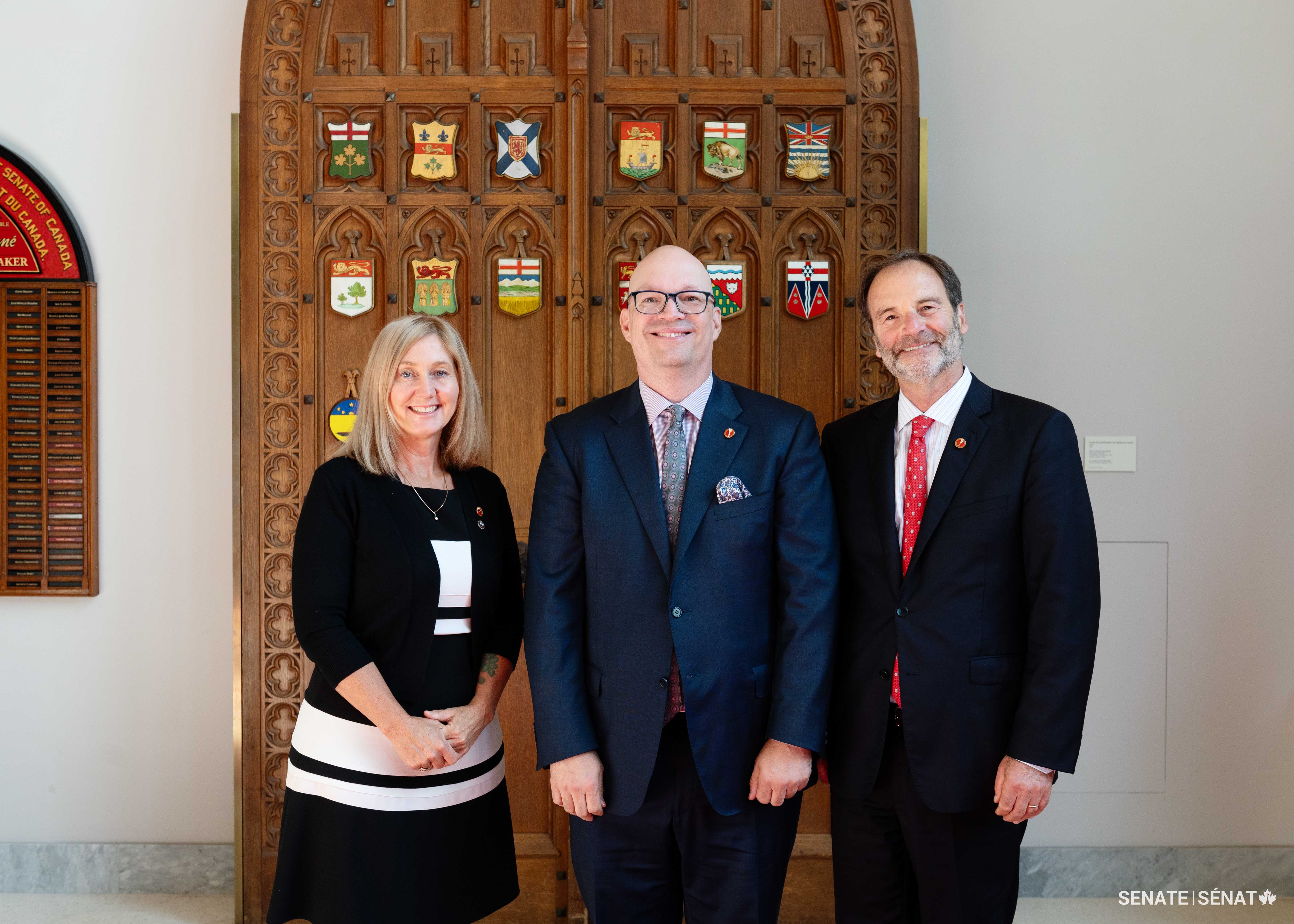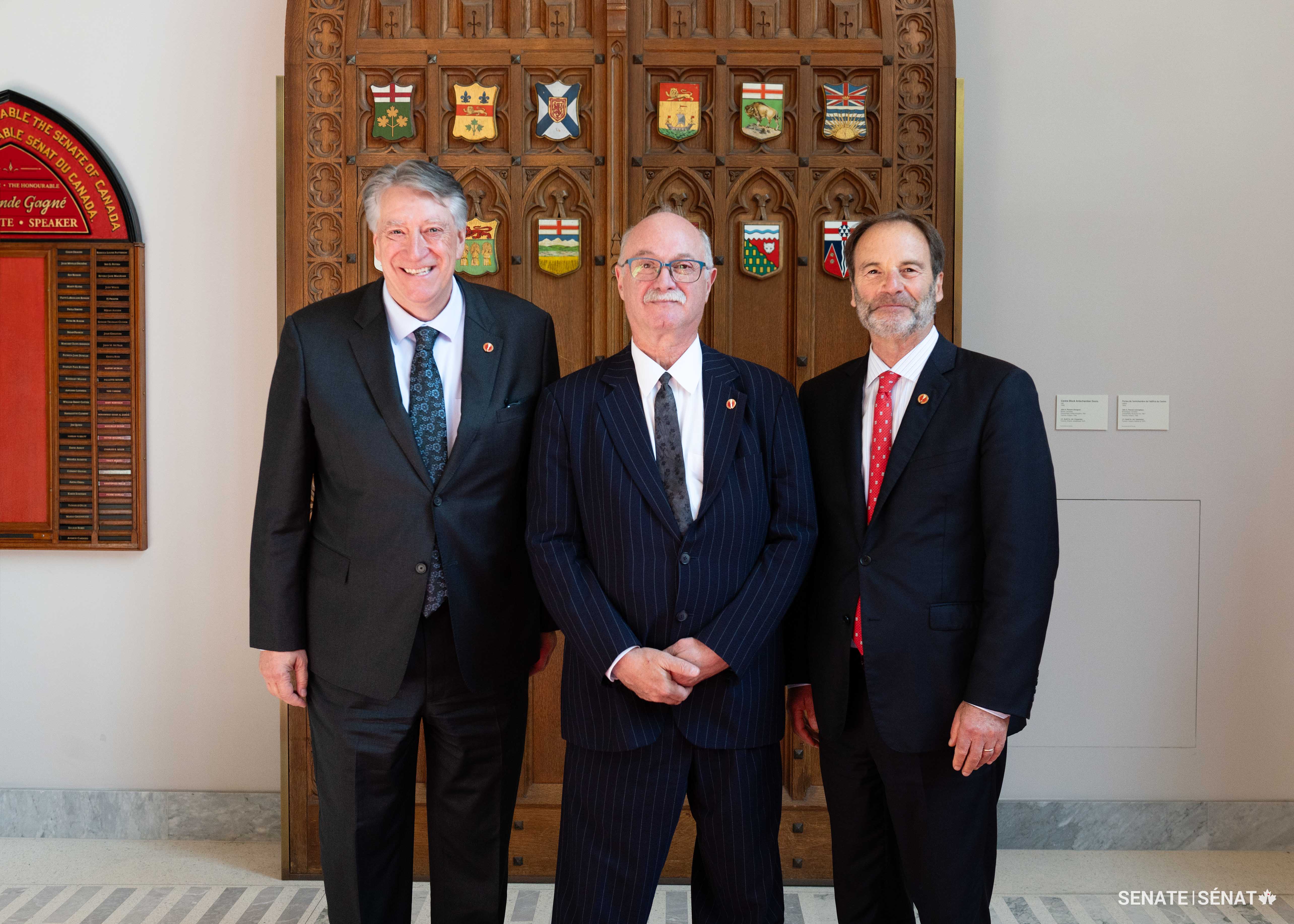 From left, senators Marc Gold, Victor Boudreau and Joan Kingston pose outside the Red Chamber doors ahead of Senator Boudreau’s swearing-in ceremony on September 17, 2024.