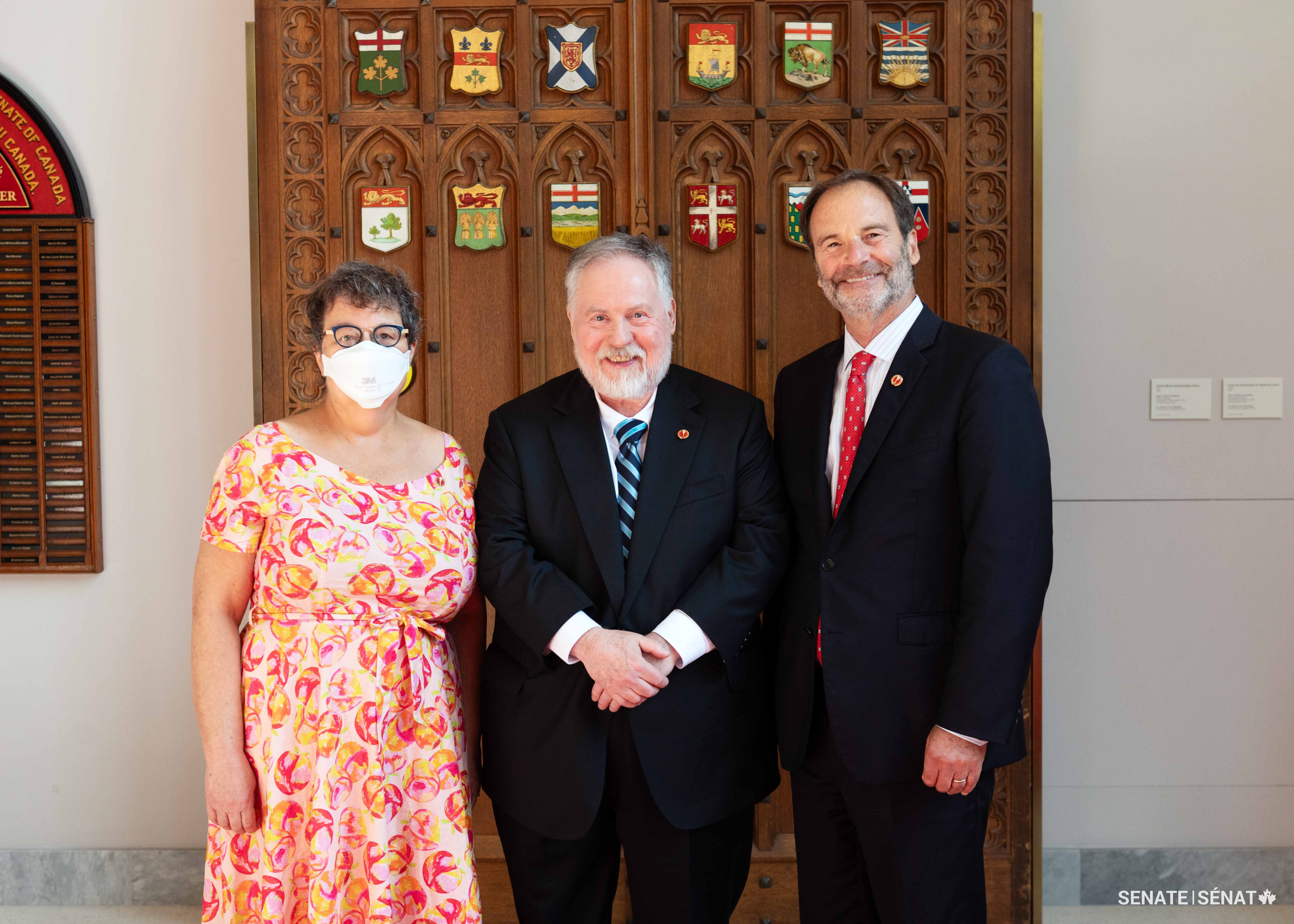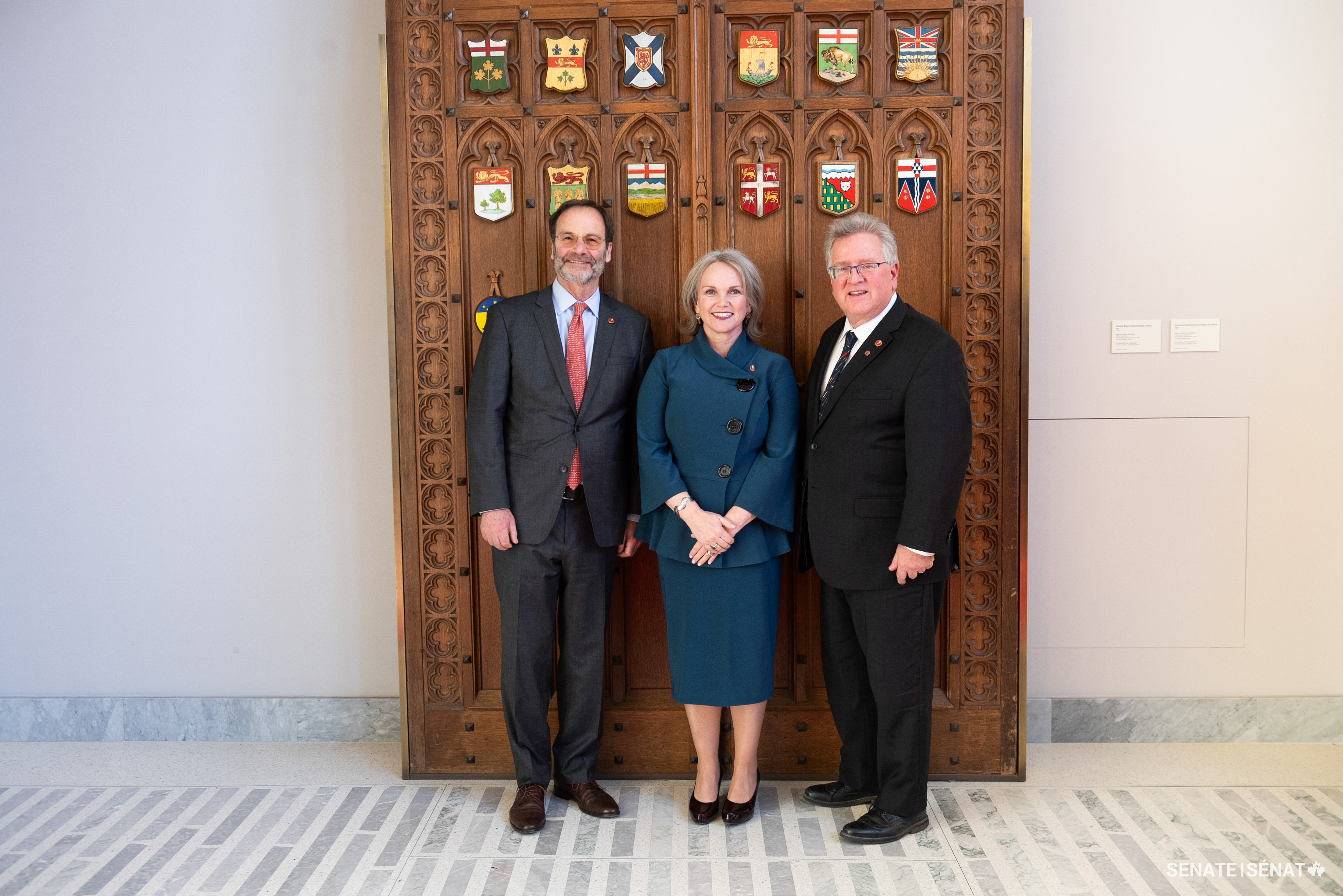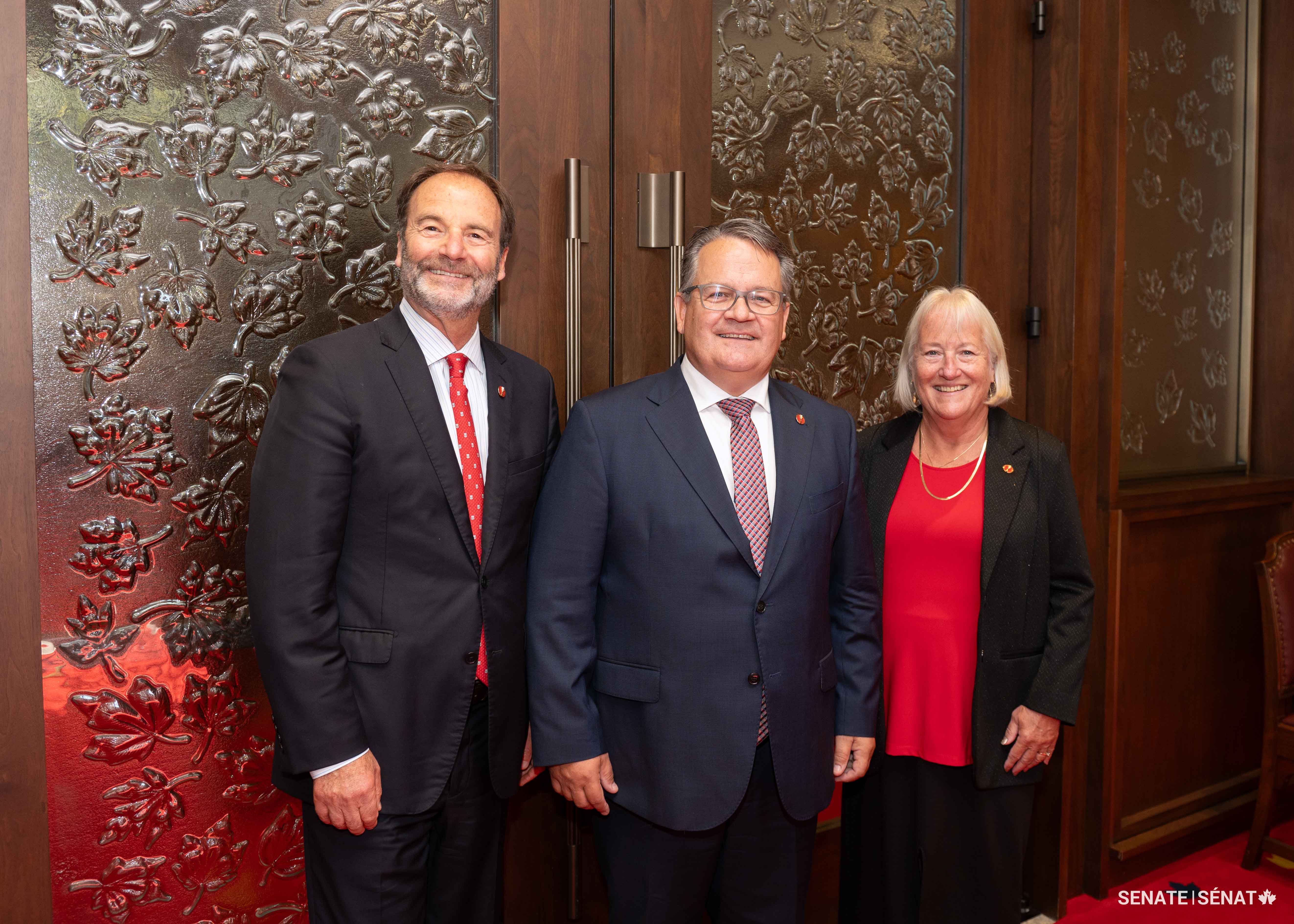 From left, senators Marc Gold, Victor Boudreau and Joan Kingston pose outside the Red Chamber doors ahead of Senator Boudreau’s swearing-in ceremony on September 17, 2024.