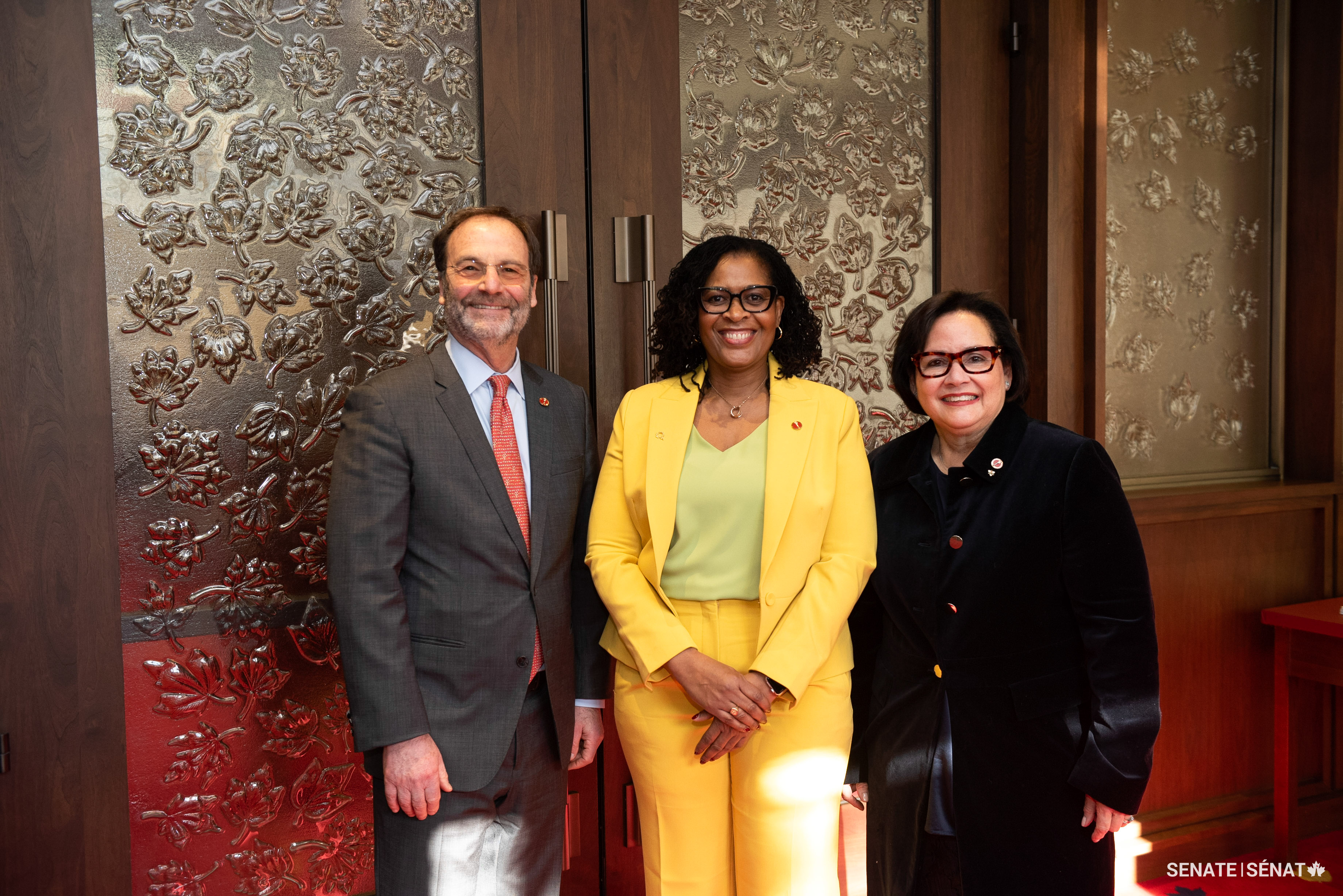 Senator Paulette Senior, centre, poses outside the Red Chamber with senators Marc Gold and Rosemary Moodie ahead of Senator Senior’s swearing-in ceremony on February 6, 2024.