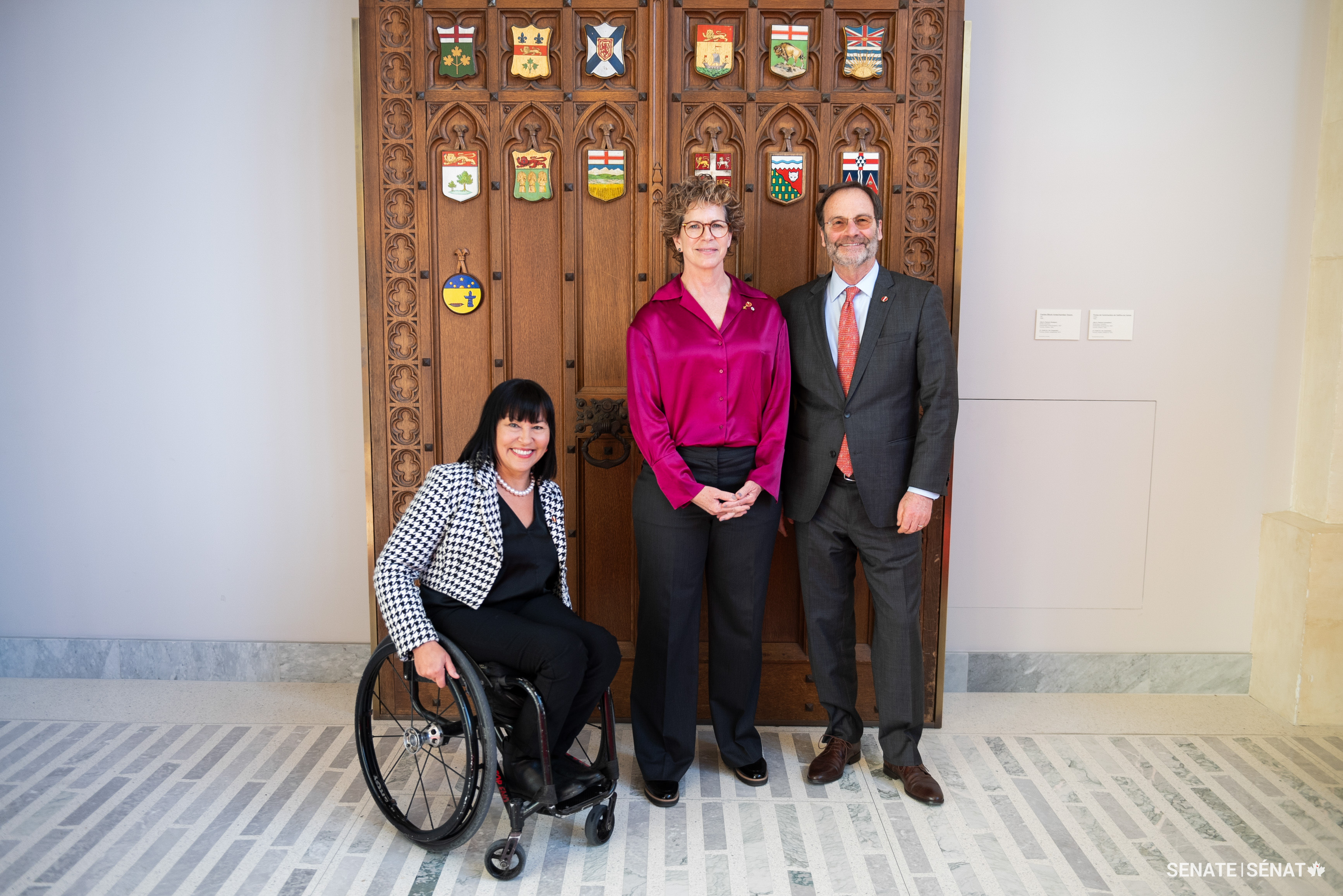 Senator Marnie McBean, centre, stands with senators Chantal Petitclerc and Marc Gold ahead of Senator McBean’s swearing-in ceremony on February 6, 2024.