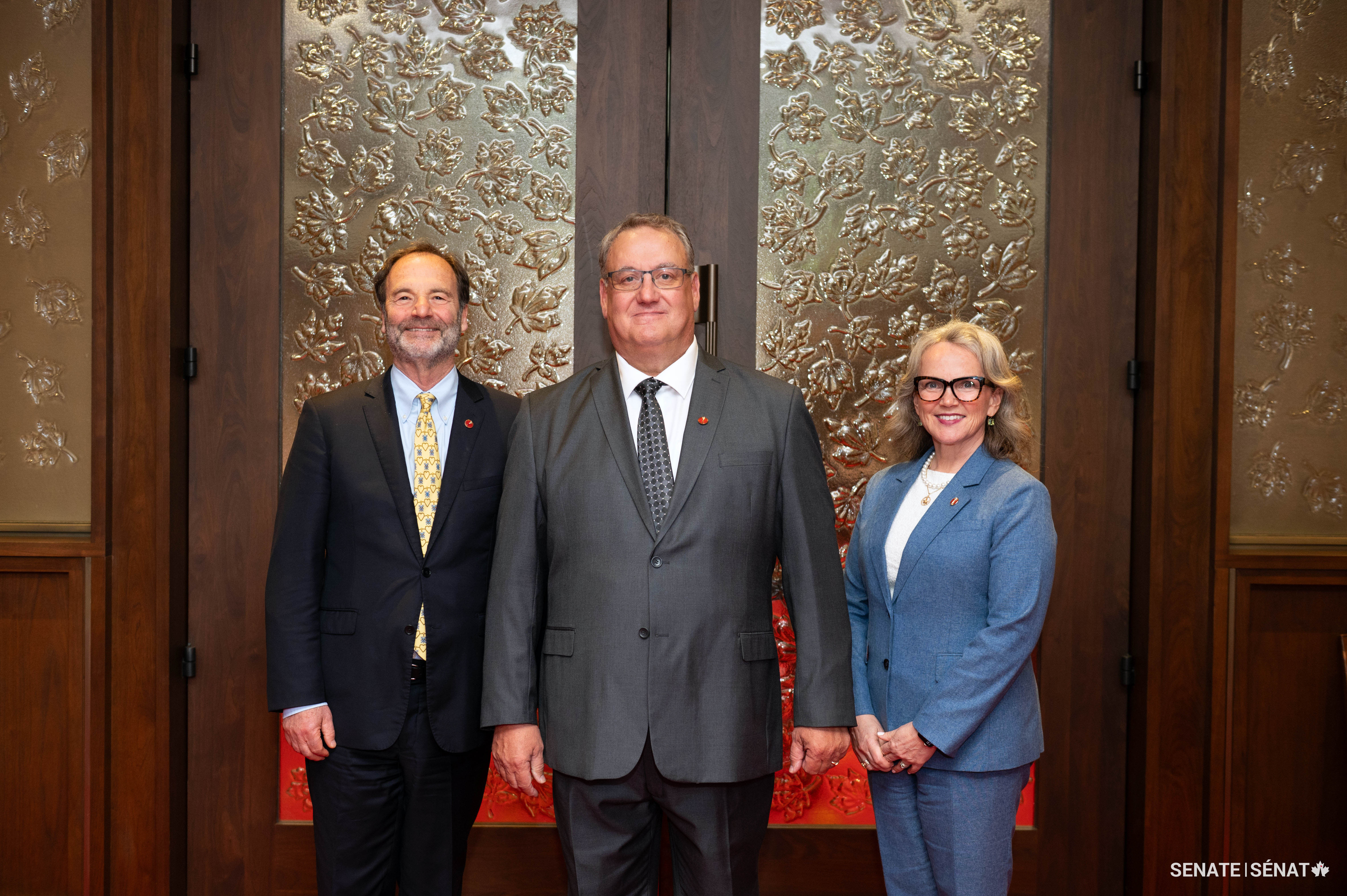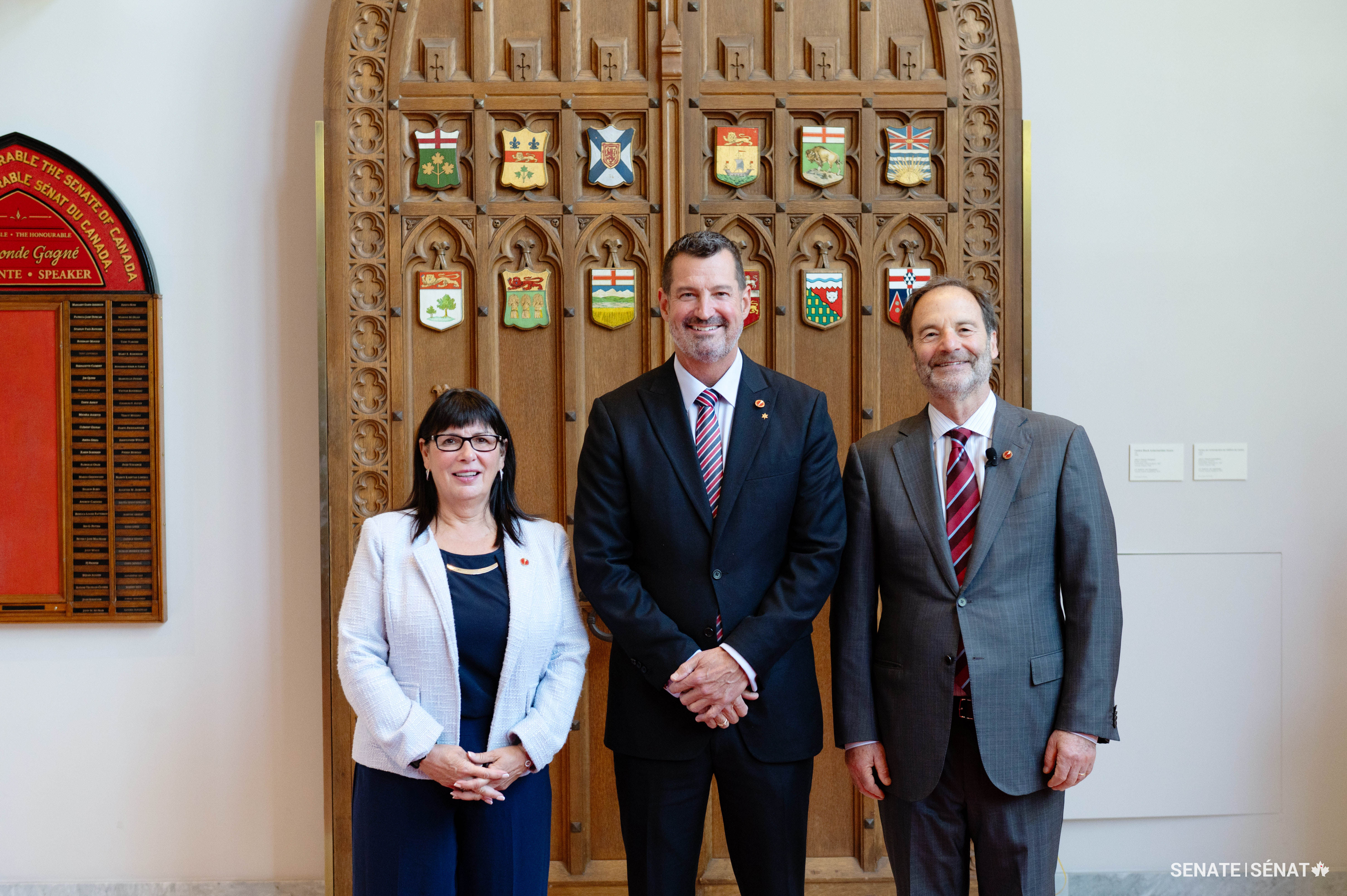Senator Todd Lewis, centre, poses outside the Red Chamber ahead of his swearing-in ceremony on May 29, 2025, with senators Mary Robinson and Marc Gold.