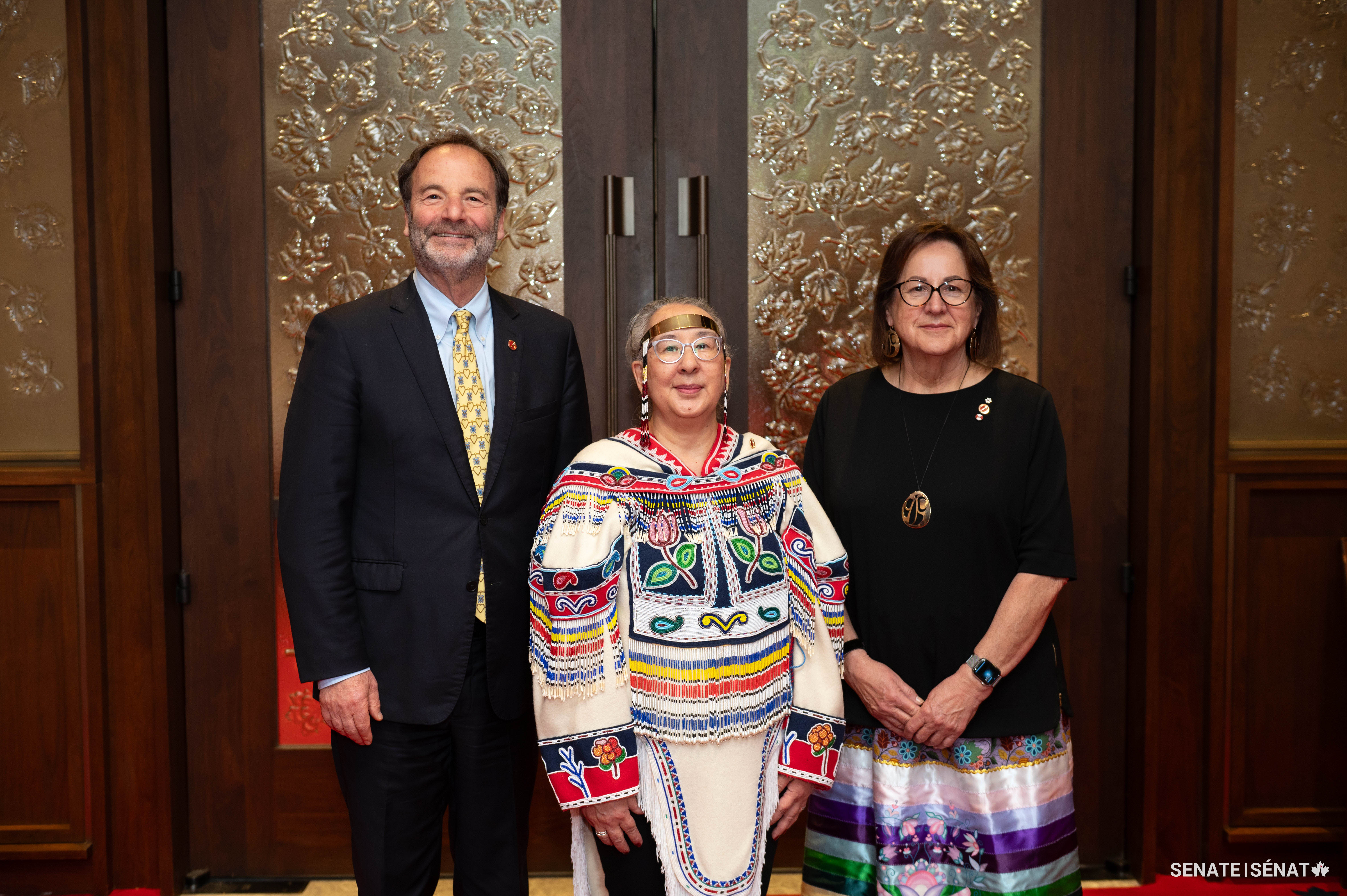 Senator Nancy Karetak-Lindell, centre, poses outside the Red Chamber ahead of her swearing-in ceremony on May 29, 2025, with senators Marc Gold and Margo Greenwood.