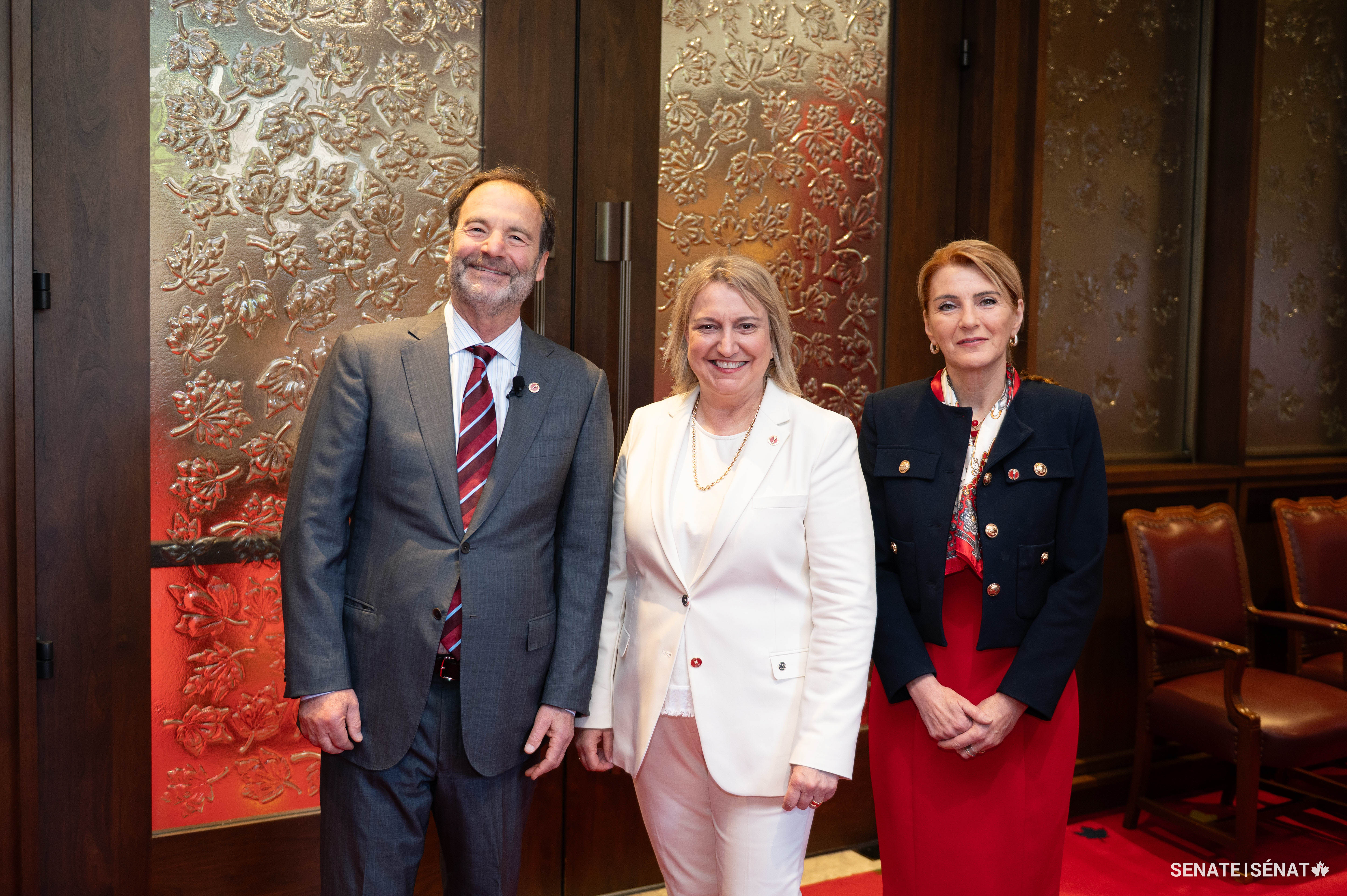 Senator Martine Hébert, centre, poses outside the Red Chamber ahead of her swearing-in ceremony on May 26, 2025, with senators Marc Gold and Manuelle Oudar.