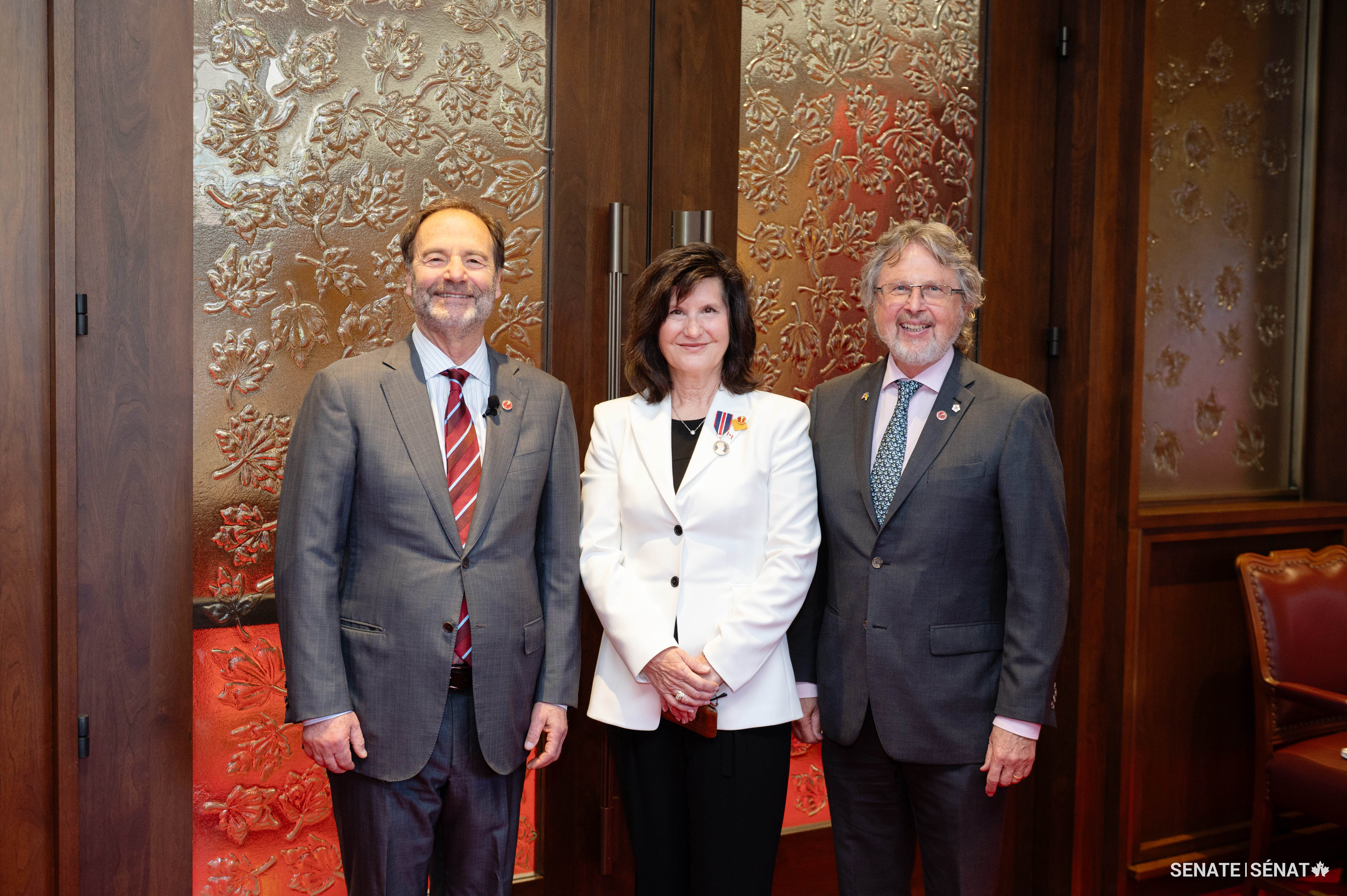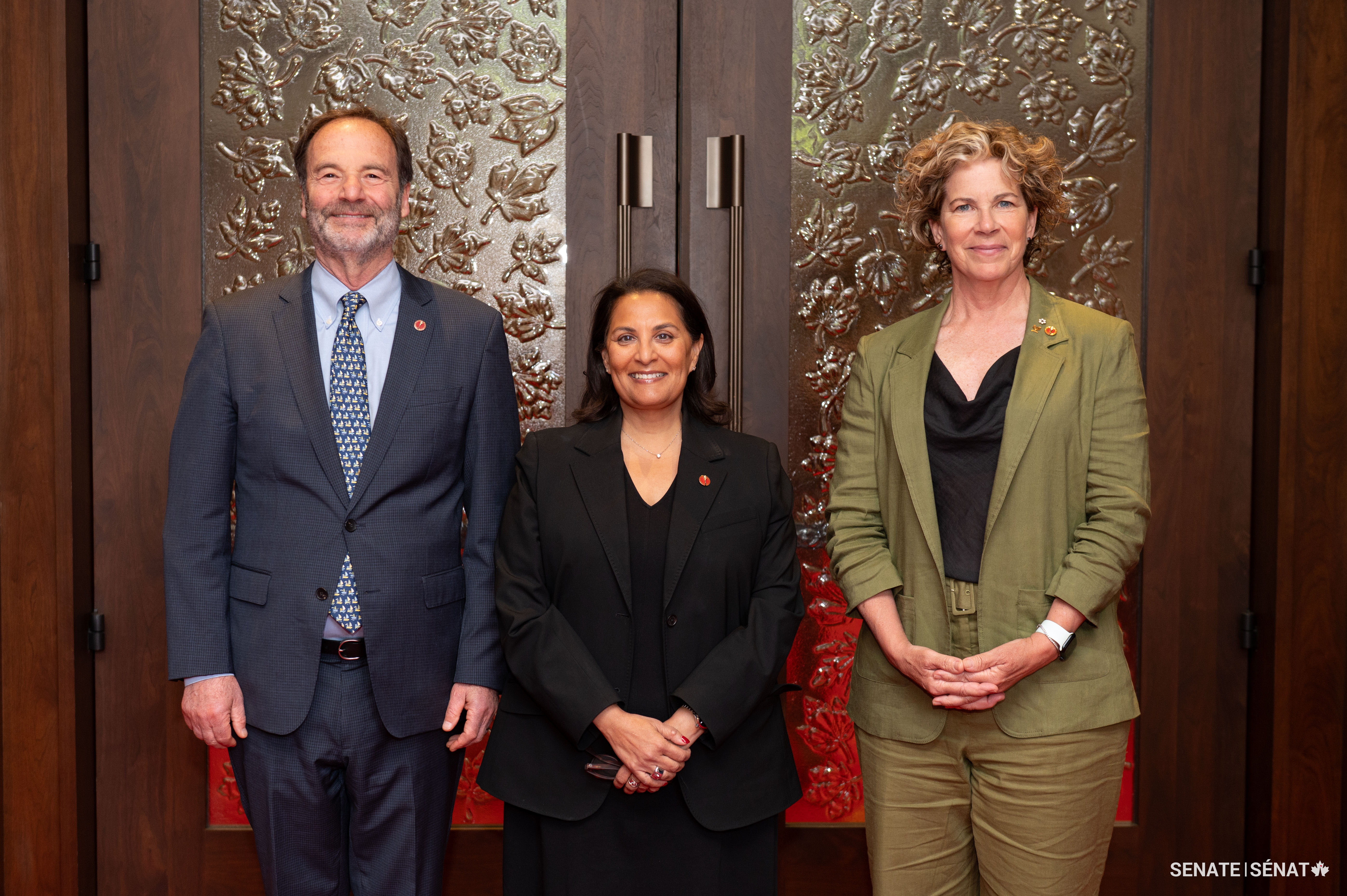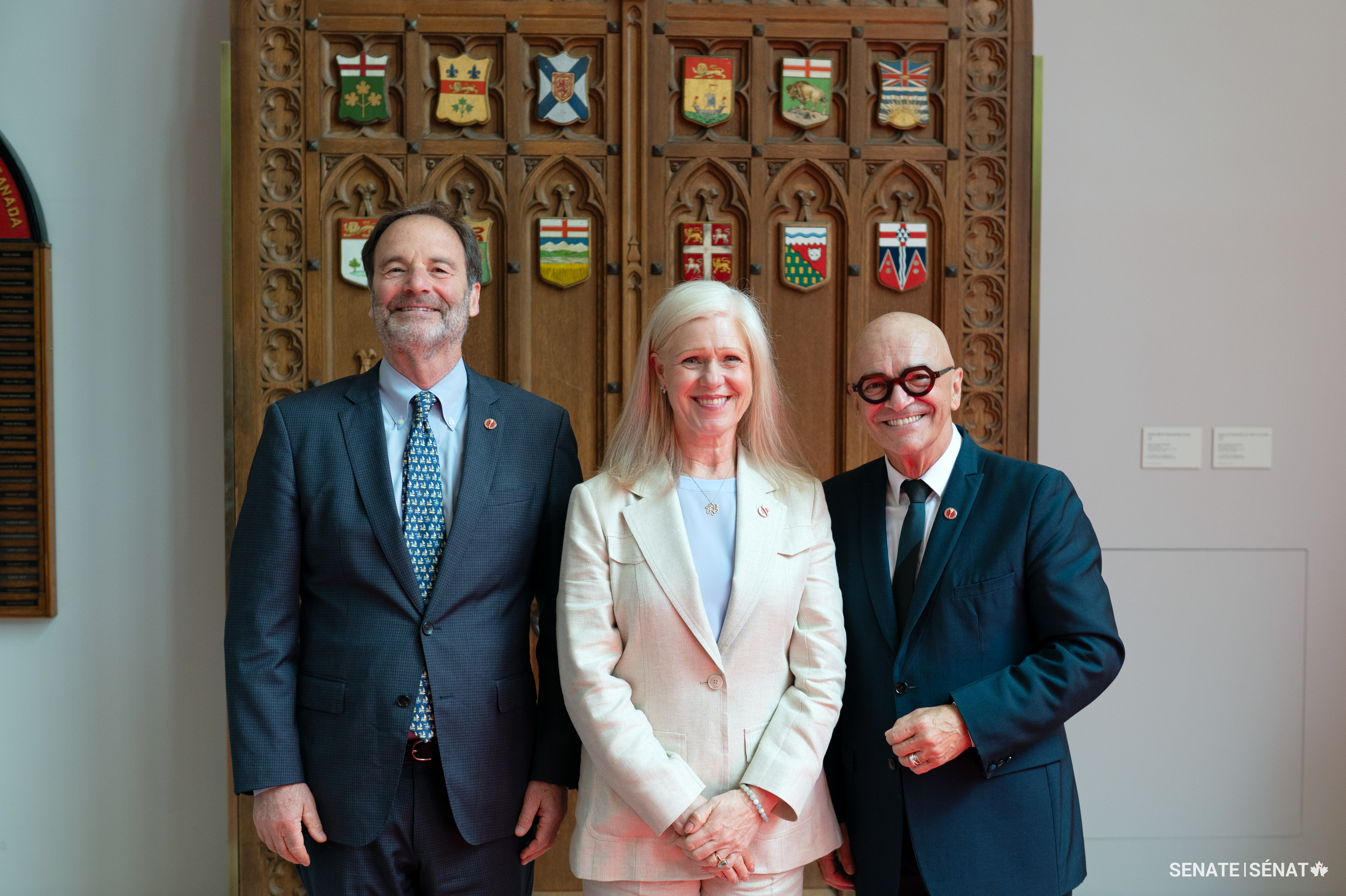 Senator Katherine Hay, centre, poses outside the Red Chamber ahead of her swearing-in ceremony on May 26, 2025, with senators Marc Gold, left, and Stan Kutcher.