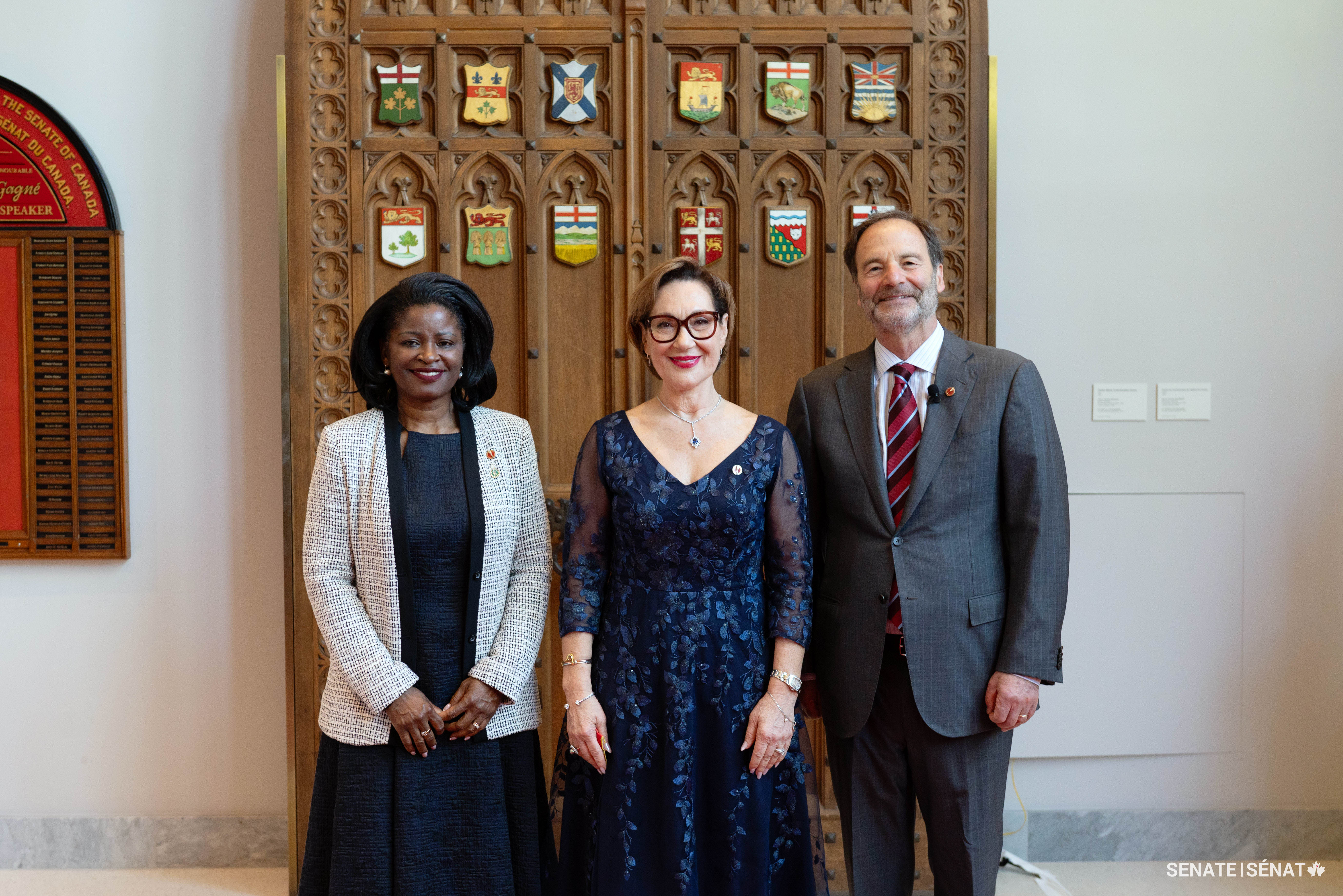 Senator Danièle Henkel, centre, poses outside the Red Chamber ahead of her swearing-in ceremony on May 26, 2025, with senators Amina Gerba and Marc Gold.