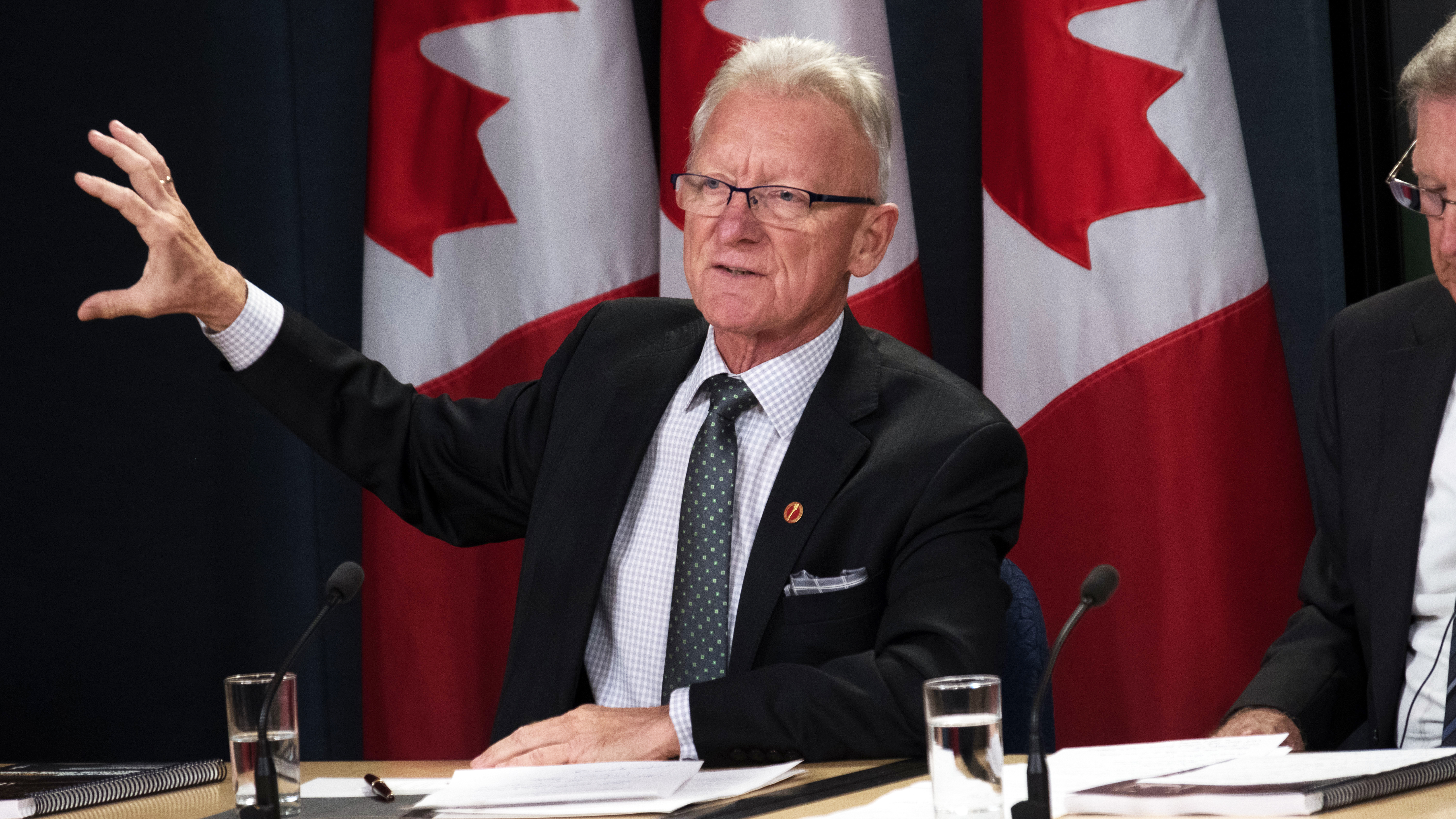 Senator Boisvenu speaks at a Senate Committee on Legal and Constitutional Affairs press conference in 2017 following the publication of its report on court delays.