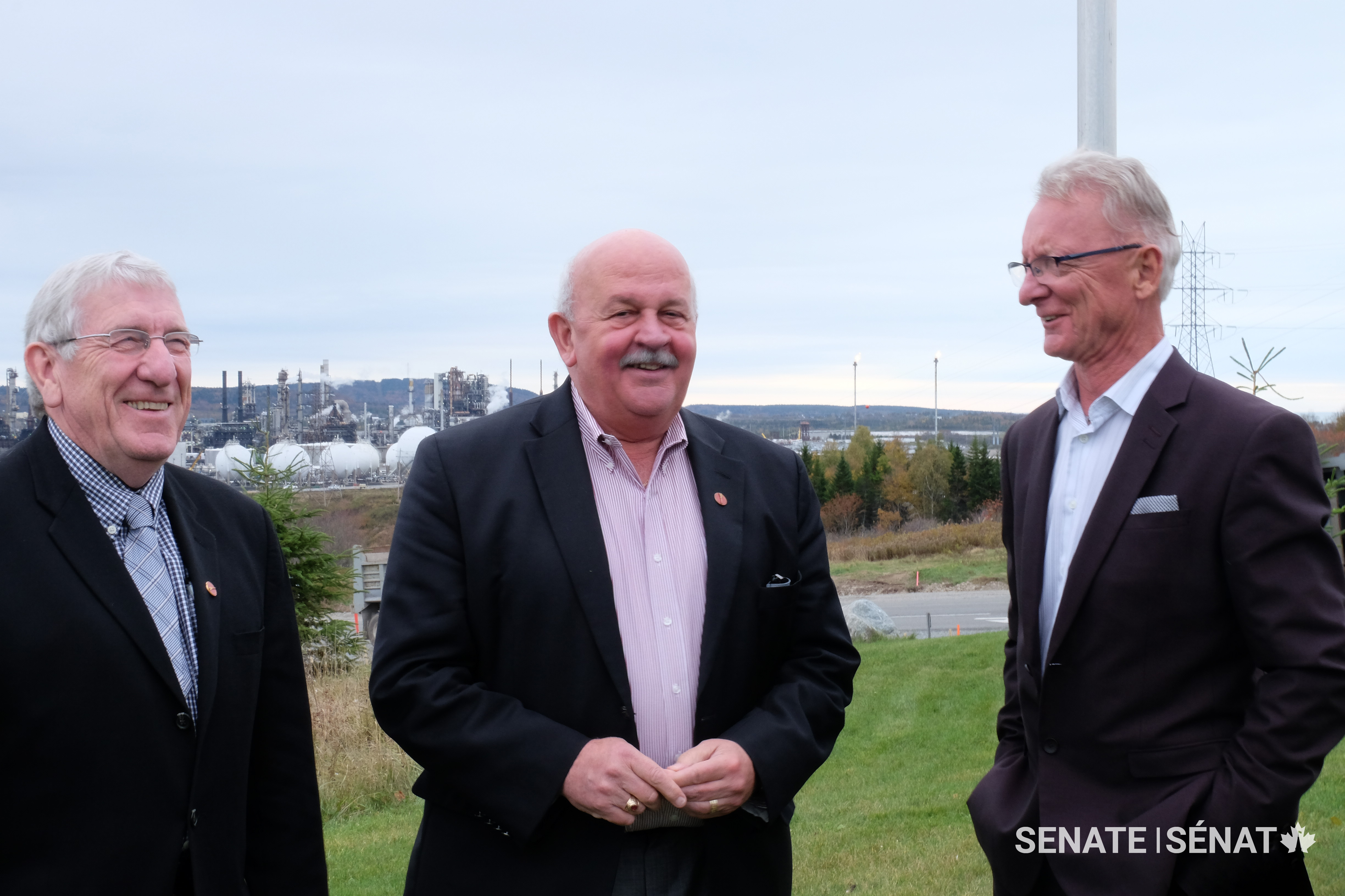 Former senators Norman E. Doyle, left, and Terry M. Mercer, centre, share a moment with Senator Boisvenu during a fact-finding mission on pipelines.