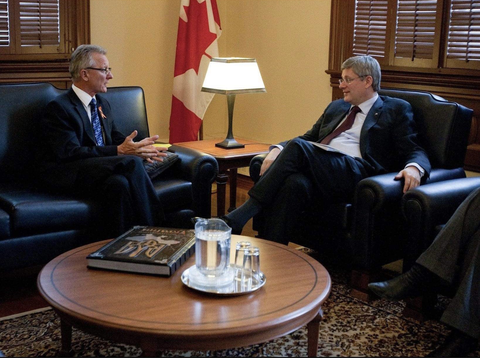 Senator Pierre-Hugues Boisvenu, left, speaks with former prime minister Stephen Harper in 2014. (Photo credit: Office of Senator Pierre-Hugues Boisvenu)