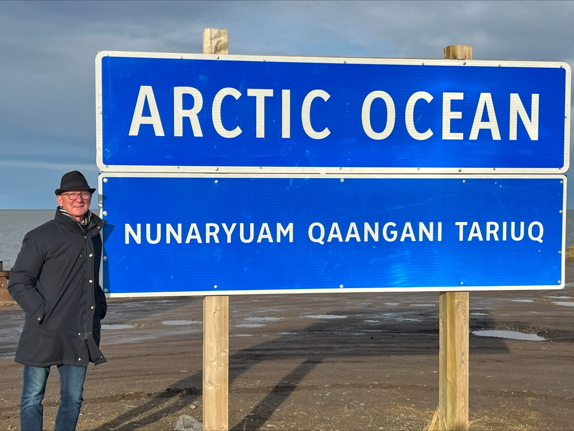 In Tuktoyaktuk, Northwest Territories, the Senator stands next to a sign that reads “Arctic Ocean” during a fact-finding mission in 2022. (Photo credit: Office of Senator Pierre-Hugues Boisvenu)