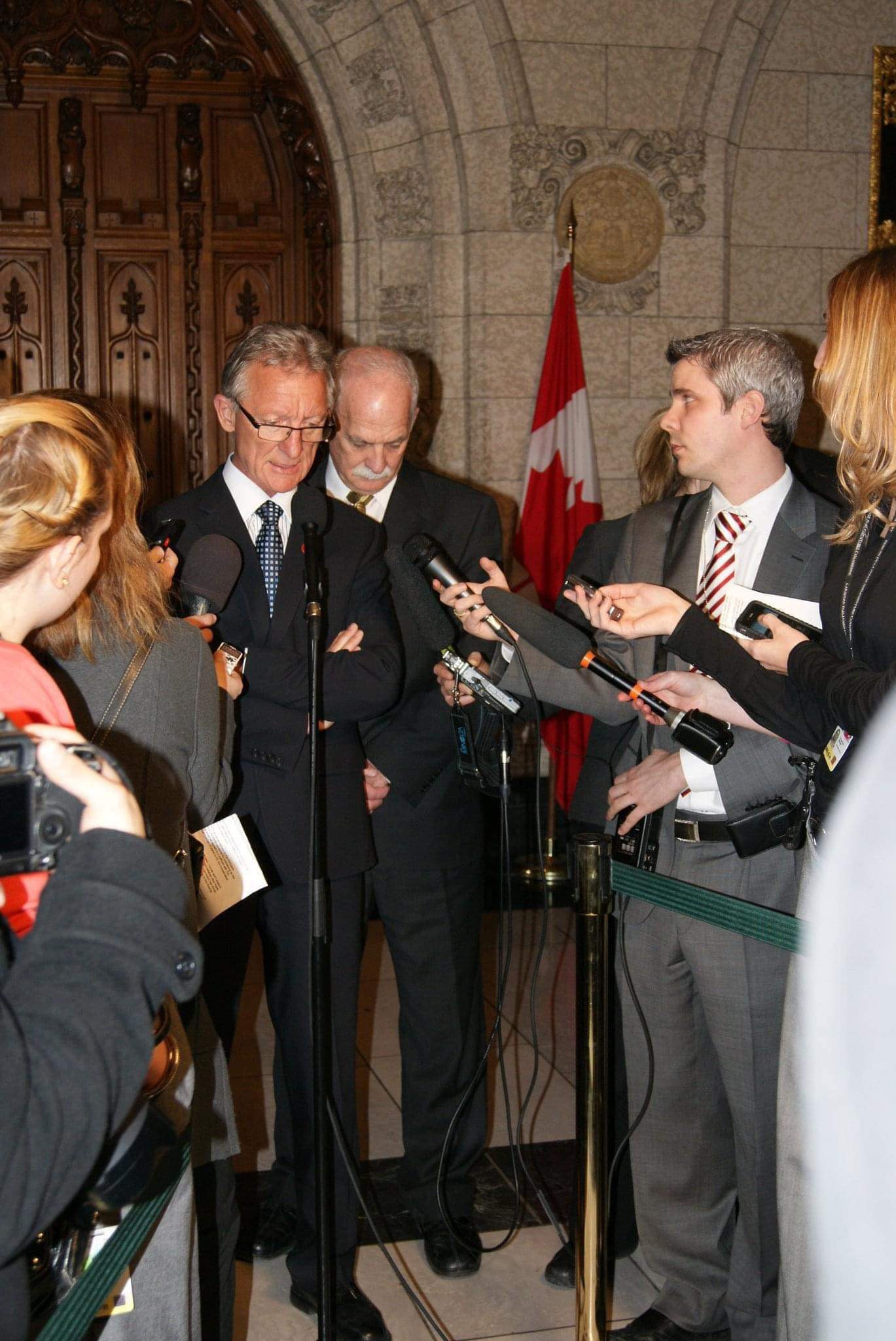 Senator Boisvenu speaks at a press conference in Centre Block with former public safety minister Vic Toews in 2012 when Bill C-37, which doubled the victim surcharge amounts, was introduced. (Photo credit: Office of Senator Pierre-Hugues Boisvenu)