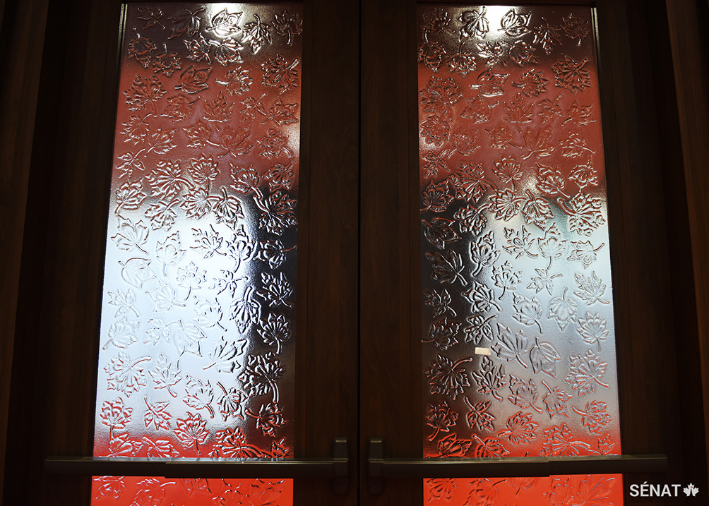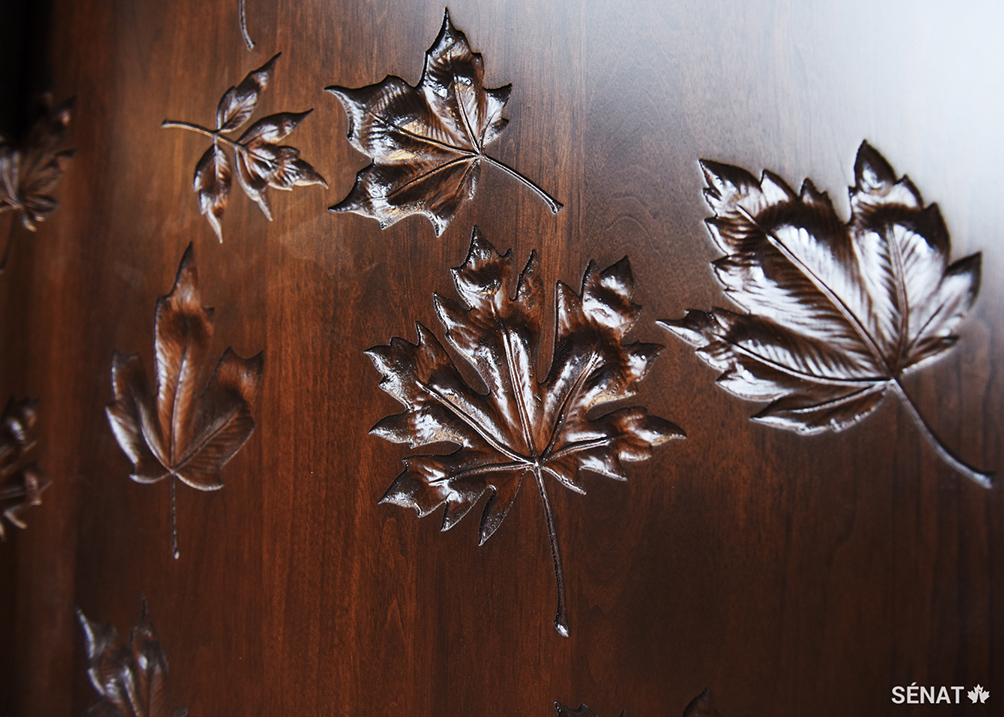 Des portes en noyer donnent accès à la Chambre du Sénat. Elles sont décorées d’un motif de feuilles d’érable — symbole du pays que sert le Parlement. Les portes ont été sculptées à l’aide d’une machine dans un atelier de la Beauce, une région au sud de la Ville de Québec.